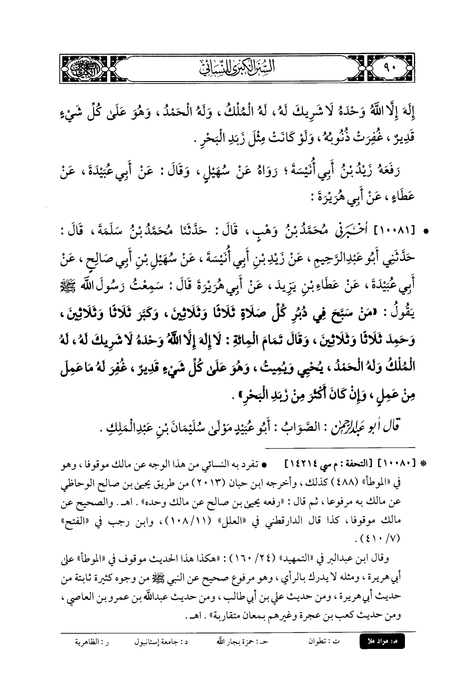 10080- أَخبَرنا قُتَيبَةُ بنُ سَعِيدٍ، عَن مَالِكٍ، عَن أَبي عُبَيدٍ، مَوْلَى سُلَيمَانَ بنِ عَبدِ المَلِكِ، عَن عَطَاءِ بنِ يَزِيدَ، عَن أَبي هُرَيرَةَ قَالَ: مَنْ سَبَّحَ دُبُرَ كُلِّ صَلاةٍ ثَلاثًا وَثَلاثِينَ، وَكَبَّرَ ثَلاثًا وَثَلاثِينَ، وَحَمِدَ ثَلاثًا وَثَلاثِينَ، وَخَتَمَ المِئَةَ: بِلا إِلَهَ إِلاَّ اللهُ، وَحْدَهُ لا شَرِيكَ لَهُ، لَهُ المُلْكُ وَلَهُ الحَمْدُ، وَهُوَ عَلَى كُلِّ شَيْءٍ قَدِيرٌ، غُفِرَتْ ذُنُوبُهُ وَلَوْ كَانَتْ مِثْلَ زَبَدِ البَحْرِ.