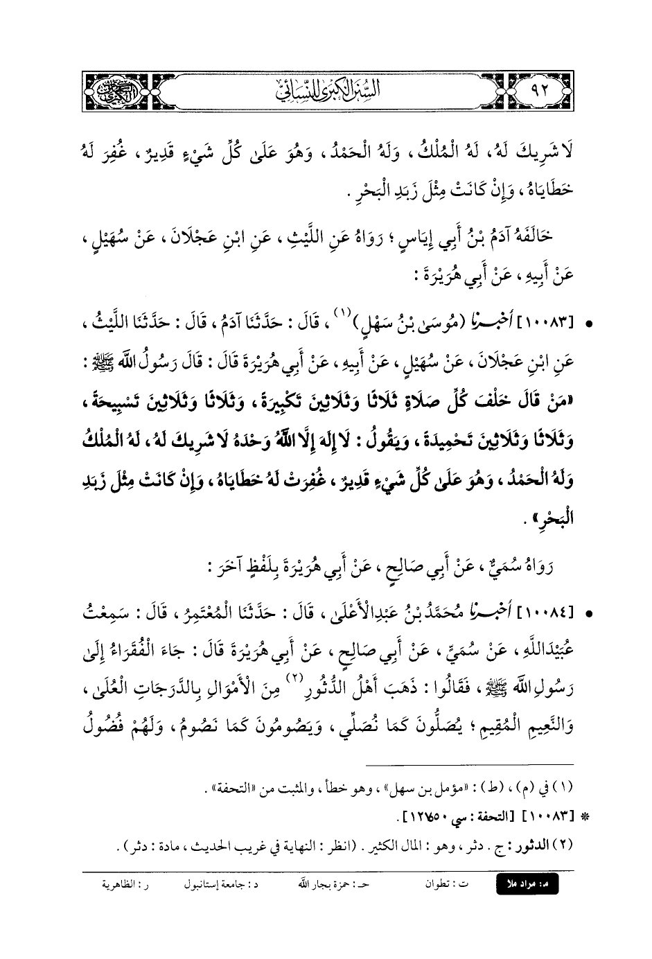 10083- أَخبَرنا مُوسَى بنُ سَهْلٍ، قَالَ: حَدثنا آدَمُ، قَالَ: حَدثنا اللَّيْثُ، عَنِ ابنِ عَجْلانَ، عَن سُهَيلٍ، عَن أَبيهِ، عَن أَبي هُرَيرَةَ قَالَ: قَالَ رَسُولُ اللهِ صَلى الله عَليه وسَلم: مَنْ قَالَ خَلْفَ كُلِّ صَلاةٍ ثَلاثًا وَثَلاثِينَ تَكْبِيرَةً، وَثَلاثًا وَثَلاثِينَ تَسْبِيحَةً، وَثَلاثًا وَثَلاثِينَ تَحْمِيدَةً، وَيَقُولُ: لا إِلَهَ إِلاَّ اللهُ، وَحْدَهُ لا شَرِيكَ لَهُ، لَهُ المُلْكُ وَلَهُ الحَمْدُ، وَهُوَ عَلَى كُلِّ شَيْءٍ قَدِيرٌ، غُفِرَتْ لَهُ خَطَايَاهُ، وَإنْ كَانَتْ مِثْلَ زَبَدِ البَحْرِ.