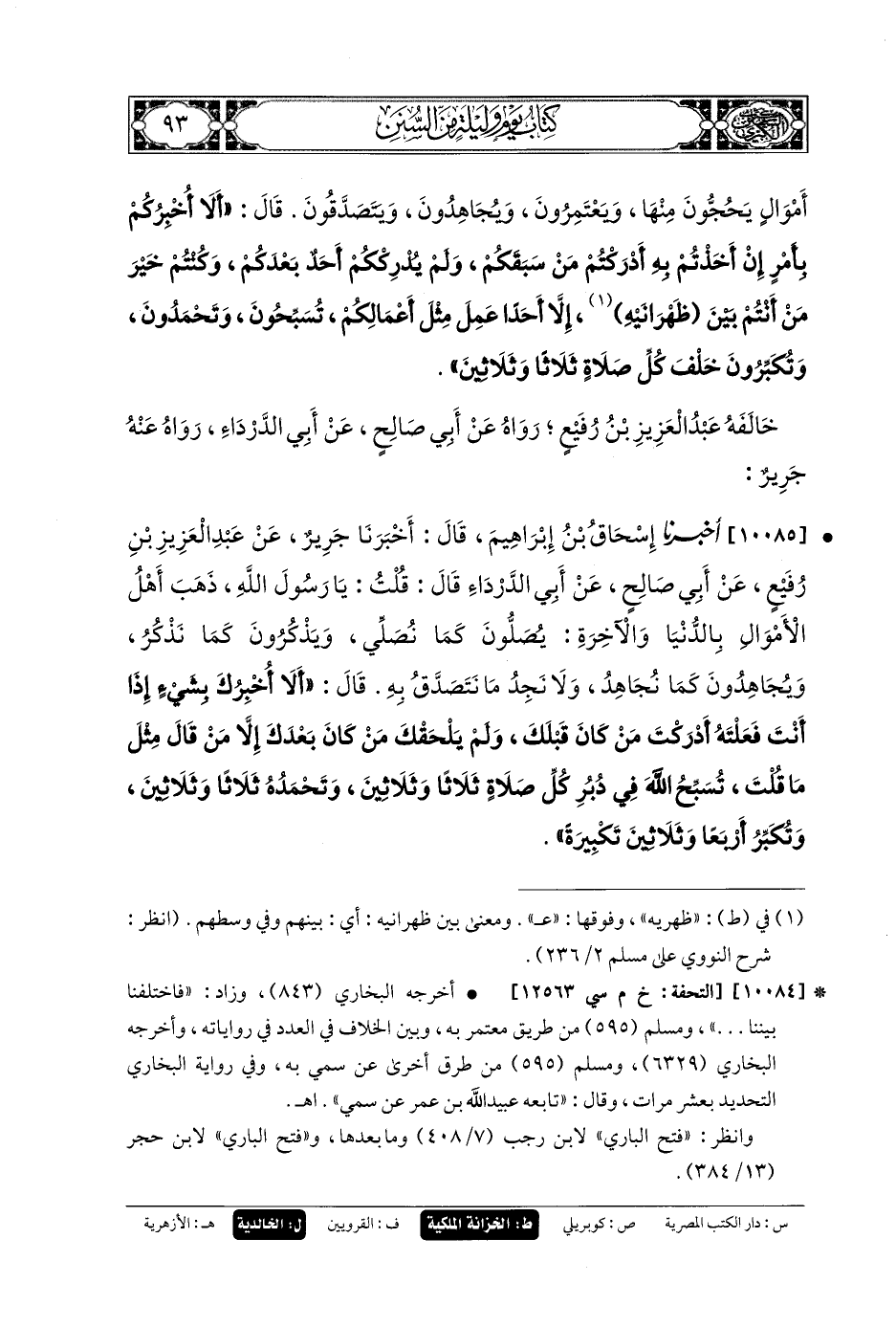 10084- أَخبَرنا مُحَمدُ بنُ عَبدِ الأَعْلَى، قَالَ: حَدثنا المُعْتَمِرُ، قَالَ: سَمِعْتُ عُبَيدَ اللهِ، عَن سُمَيٍّ، عَن أَبي صَالِحٍ، عَن أَبي هُرَيرَةَ قَالَ: جَاءَ الفُقَرَاءُ إِلَى رَسُولِ اللهِ صَلى الله عَليه وسَلم فَقَالُوا: ذَهَبَ أَهْلُ الدُّثُورِ مِنَ الأَمْوَالِ بِالدَّرَجَاتِ العُلَى، وَالنَّعِيمِ المُقِيمِ، يُصَلُّونَ كَمَا نُصَلِّي، وَيَصُومُونَ كَمَا نَصُومُ، وَلَهُمْ فُضُولُ أَمْوَالٍ يَحُجُّونَ مِنْهَا وَيَعْتَمِرُونَ، وَيُجَاهِدُونَ وَيَتَصَدَّقُونَ، قَالَ: ألا أُخْبِرُكُمْ بِأَمْرٍ إنْ أَخَذْتُمْ بِهِ أَدْرَكْتُمْ مَنْ سَبَقَكُمْ، وَلَمْ يُدْرِكُّمْ أَحَدٌ بَعْدَكُمْ، وَكُنْتُمْ خَيْرَ مَنْ أَنْتُمْ بَيْنَ ظَهْرَانَيْهِ، إِلاَّ أَحَدًا عَمِلَ مِثْلَ أَعْمَالِكُمْ؟ تُسَبِّحُونَ، وَتَحْمَدُونَ، وَتُكَبِّرُونَ خَلْفَ كُلِّ صَلاةٍ ثَلاثًا وَثَلاثِينَ.