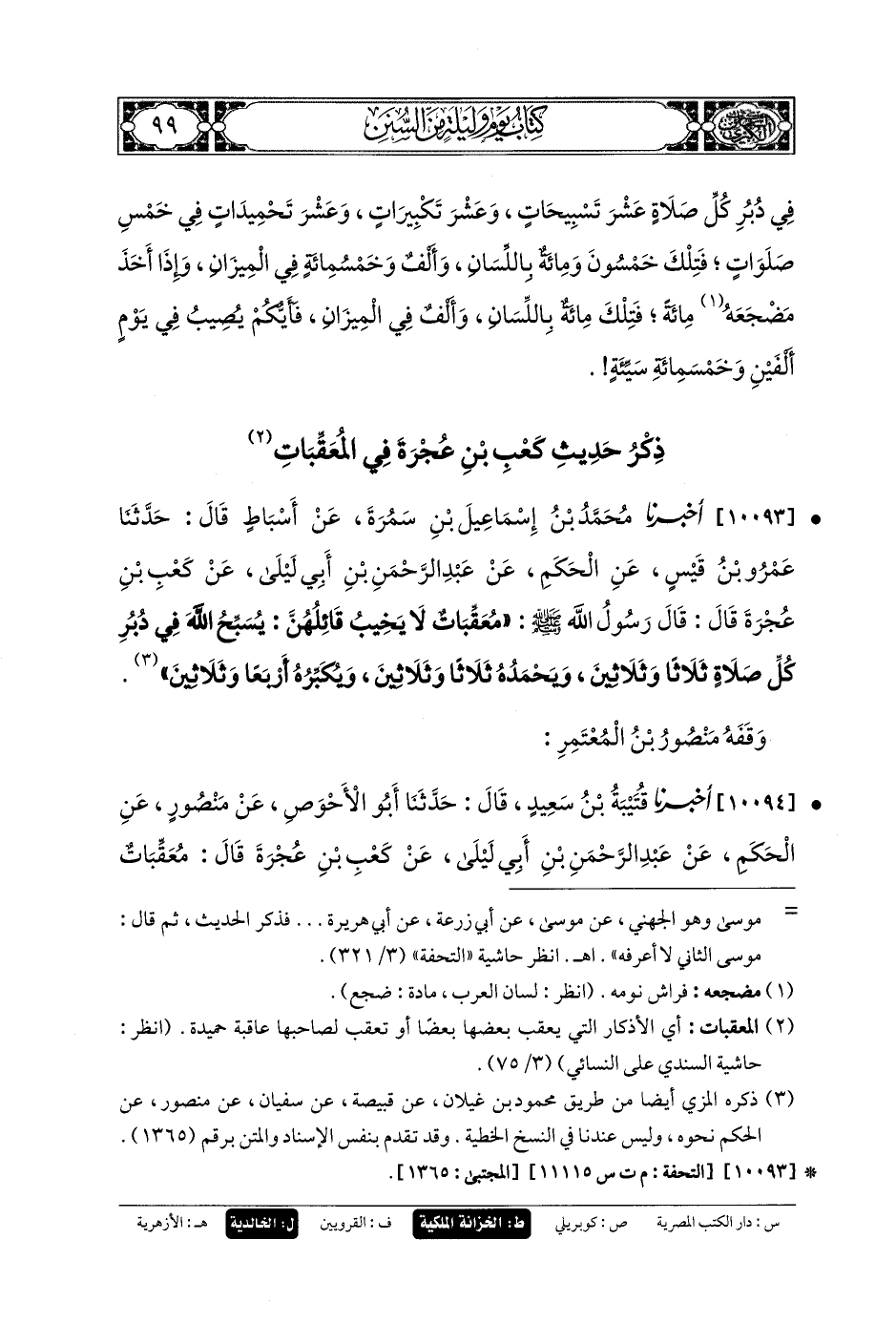 10093- أَخبَرنا مُحَمدُ بنُ إِسمَاعِيلَ بنِ سَمُرَةَ، عَن أَسْبَاطٍ، قَالَ: حَدثنا عَمرُو بنُ قَيسٍ، عَنِ الحَكَمِ، عَن عَبدِ الرَّحمَنِ بنِ أَبي لَيْلَى، عَن كَعْبِ بنِ عُجْرَةَ قَالَ: قَالَ رَسُولُ اللهِ صَلى الله عَليه وسَلم: مُعَقِّبَاتٌ لا يَخِيبُ قَائِلُهُنَّ: يُسَبِّحُ اللهَ فِي دُبُرِ كُلِّ صَلاةٍ ثَلاثًا وَثَلاثِينَ، وَيَحْمَدُهُ ثَلاثًا وَثَلاثِينَ، وَيُكَبِّرُهُ أَرْبَعًا وَثَلاثِينَ.