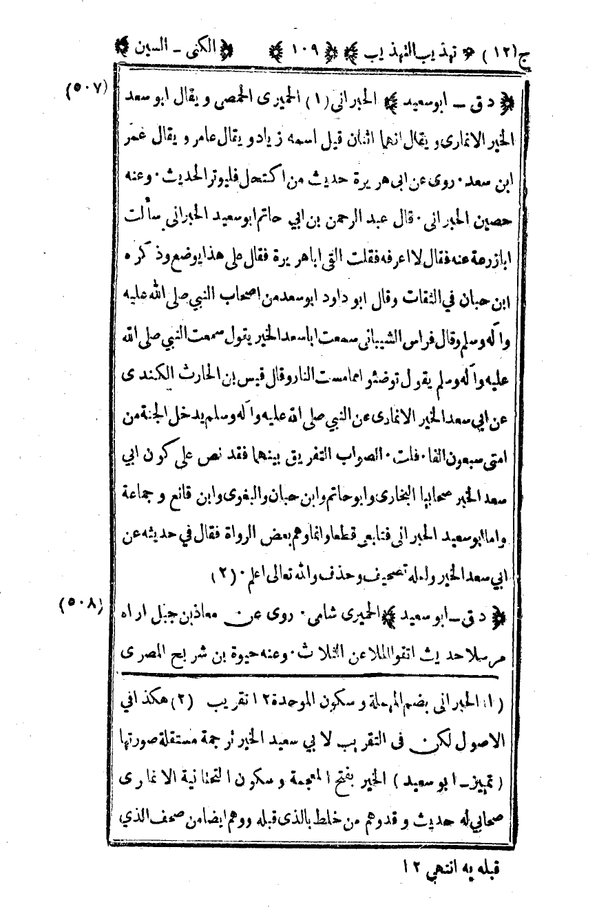 506- "د ق - أبو سعيد" الحبراني1 الحميري الحمصي ويقال أبو سعد الخير الأنماري ويقال إنهما اثنان قيل اسمه زياد ويقال عامر ويقال عمر بن سعد روى عن أبي هريرة حديث "من اكتحل فليوتر" الحديث وعنه حصين الحبراني قال عبد الرحمن بن أبي حاتم أبو سعيد الحبراني سألت أبا زرعة عنه فقال لا أعرفه فقلت ألقي أبا هريرة فقال على هذا يوضع وذكره ابن حبان في الثقات وقال أبو داود أبو سعد من أصحاب النبي صلى الله عليه وآله وسلم وقال فراس الشيباني سمعت أبا سعد الخير يقول سمعت النبي صلى الله عليه وآله وسلم يقول "توضؤوا مما مست النار" وقال قيس بن الحارث الكندي عن أبي سعد الخير الأنماري عن النبي صلى الله عليه وآله وسلم "يدخل الجنة من أمتي سبعون ألفا" قلت الصواب التفريق بينهما فقد نص على كون أبي سعد الخير صحابيا البخاري وأبو حاتم وابن حبان والبغوي وابن قانع وجماعة وأما أبو سعيد الحبراني فتابعي قطعا وإنما وهم بعض الرواة فقال في حديثه عن أبي سعد الخير ولعله تصحيف وحذف والله تعالى أعلم.2