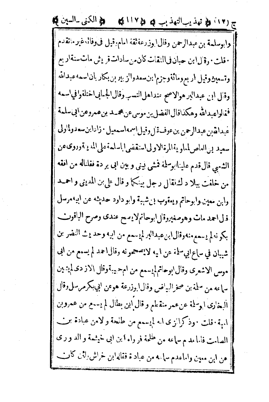وأبو سلمة بن عبد الرحمن وقال أبو زرعة ثقة إمام وقيل في وفاته غير ما تقدم قلت وقال ابن حبان في الثقات كان من سادات قريش مات سنة أربع وتسعين وقيل أربع ومائة وجزم ابن سعد والزبير بن بكار بأن اسمه عبد الله وقال ابن عبد البر هو الأصح عند أهل النسب وقال الجنابي احتلفوا في اسمه فقالوا عبد الله وهكذا قال الفضل بن موسى عن محمد بن عمرو عن أبي سلمة عبد الله بن عبد الرحمن بن عوف قال وقيل اسمه إسماعيل زاد بن سعد ولما ولي سعيد بن العاص لمعاوية المرة الأولى استقضى أبا سلمة على المدينة وروى عن الشعبي قال قدم علينا أبو سلمة فمشى بيني وبين أبي بردة فقلنا له من وافقه من خلفت ببلادك فقال رجل بينكما وقال علي بن المديني وأحمد وابن معين وأبو حاتم ويعقوب بن شيبة وأبو داود حديثه عن أبيه مرسل قال أحمد مات وهو صغير وقال أبو حاتم لا يصح عندي وصرح الباقون بكونه لم يسمع منه وقال ابن عبد البر لم يسمع من أبيه وحديث النضر بن شيبان في سماع أبي سلمة عن أبيه لا يصححونه وقال أحمد لم يسمع من أبي موسى الأشعري وقال أبو حاتم لم يسمع من أم حبيبة وقال الأزدي لم يتبين سماعه من سلمة بن صخر البياضي وقال أبو زرعة هو عن أبي بكر مرسل وقال البخاري أبو سلمة عن عمر منقطع وقال ابن بطال لم يسمع من عمرو بن أمية قلت وذكر المزي أنه لم يسمع من طلحة ولا من عبادة بن الصامت فأما عدم سماعه من طلحة فرواه ابن أبي خيثمة والدوري عن ابن معين وأما عدم سماعه من عبادة فقال له بن خراش ولئن كان