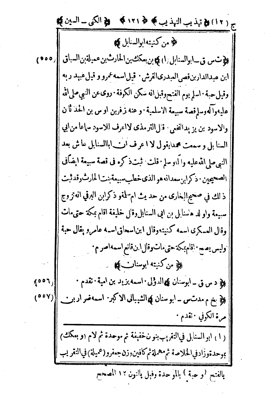 1 أبو السنابل في التقريب بنون خفيفة ثم موحدة ثم لام "وبعكك" بموحدة وزاد في الخلاصة ثم مهملة ثم كافين وزن جعفر و"عميلة" في التقريب بالفتح و"حبة" بالموحدة وقيل بالنون 12 المصحح.