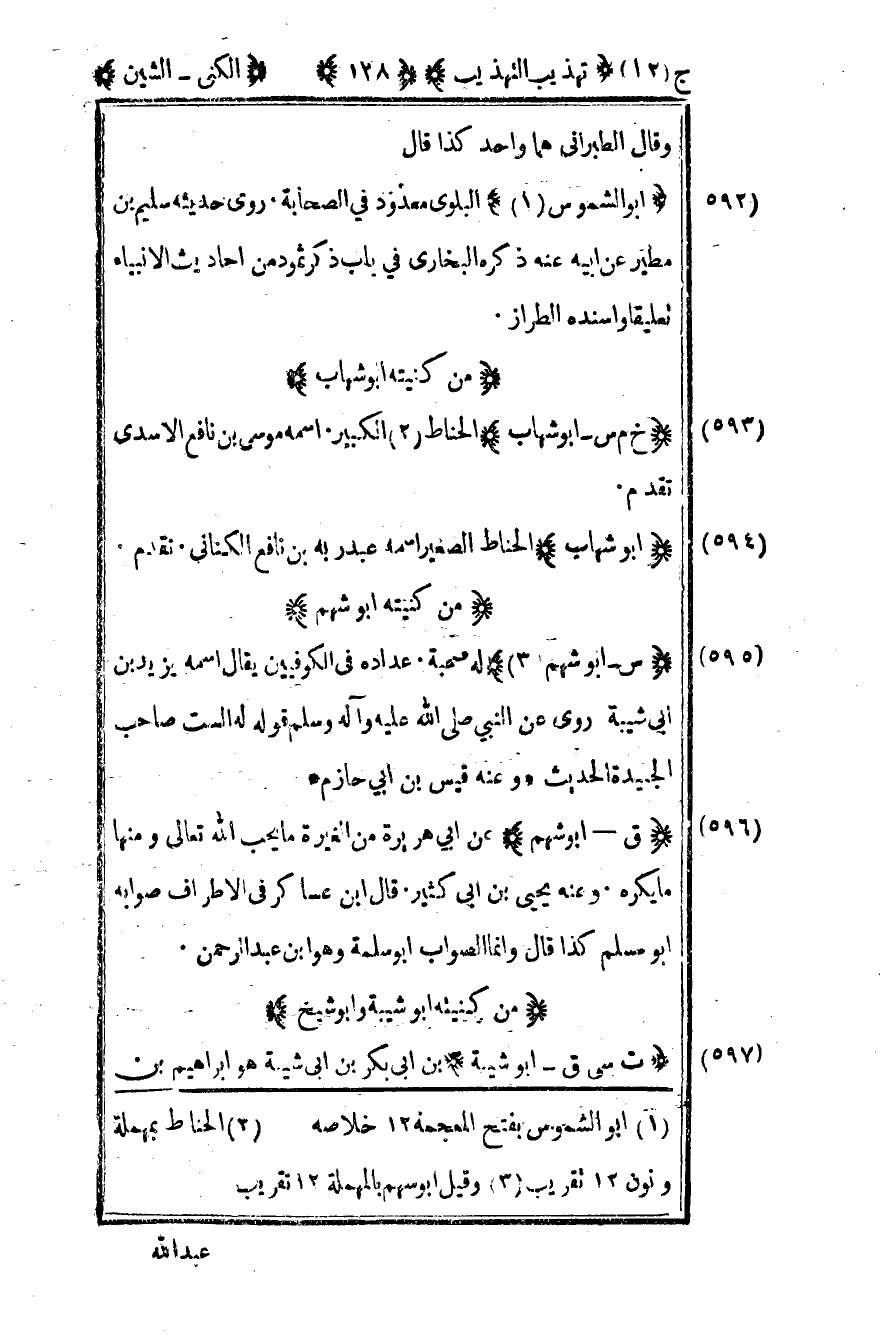 594- "س - أبو شهم1" له صحبة عداده في الكوفيين يقال اسمه يزيد بن أبي شيبة روى عن النبي صلى الله عليه وآله وسلم قوله له ألست صاحب الجيدة الحديث وعنه قيس بن أبي حازم.