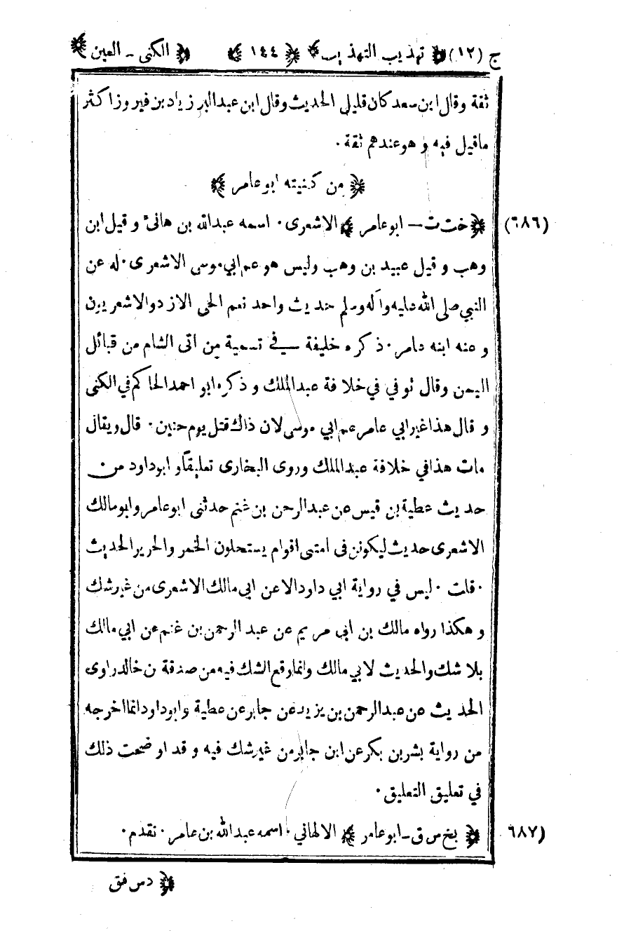685- "خت ت - أبو عامر" الأشعري اسمه عبد الله بن هانئ وقيل بن وهب وقيل عبيد بن وهب وليس هو عم أبي موسى الأشعري له عن النبي صلى الله عليه وآله وسلم حديث واحد "نعم الحي الأزد والأشعريون" وعنه ابنه عامر ذكره خليفة في تسمية من أتى الشام من قبائل اليمن وقال توفي في خلافة عبد الملك وذكره أبو أحمد الحاكم في الكنى وقال هذا غير أبي عامر عم أبي موسى لأن ذاك قتل يوم حنين قال ويقال مات هذا في خلافة عبد الملك وروى البخاري تعليقا وأبو داود من حديث عطية بن قيس عن عبد الرحمن بن غنم حدثني أبو عامر وأبو مالك الأشعري حديث "ليكونن في أمتي أقوام يستحلون الخمر والحرير" الحديث قلت ليس في رواية أبي داود إلا عن أبي مالك الأشعري من غير شك وهكذا رواه مالك بن أبي مريم عن عبد الرحمن بن غنم عن أبي مالك بلا شك والحديث لأبي مالك وإنما وقع الشك فيه من صدقة بن خالد راوي الحديث عن عبد الرحمن بن يزيد عن جابر عن عطية وأبو داود إنما أخرجه من رواية بشر بن بكر عن ابن جابر من غير شك فيه وقد أوضحت ذلك في تعليق التعليق.