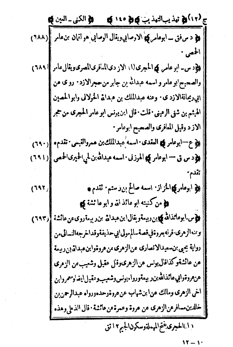 688- "د س - أبو عامر" الحجري1 الأزدي المعافري المصري ويقال عامر والصحيح أبو عامر واسمه عبد الله بن جابر من حجر الأزد روى عن أبي ريحانة الأزدي وعنه عبد الملك بن عبد الله الخولاني وأبو الحصين الهيثم بن شفي الرعيني قلت قال ابن يونس أبو عامر الحجري من حجر الأزد وقيل المعافري والصحيح أبو عامر.