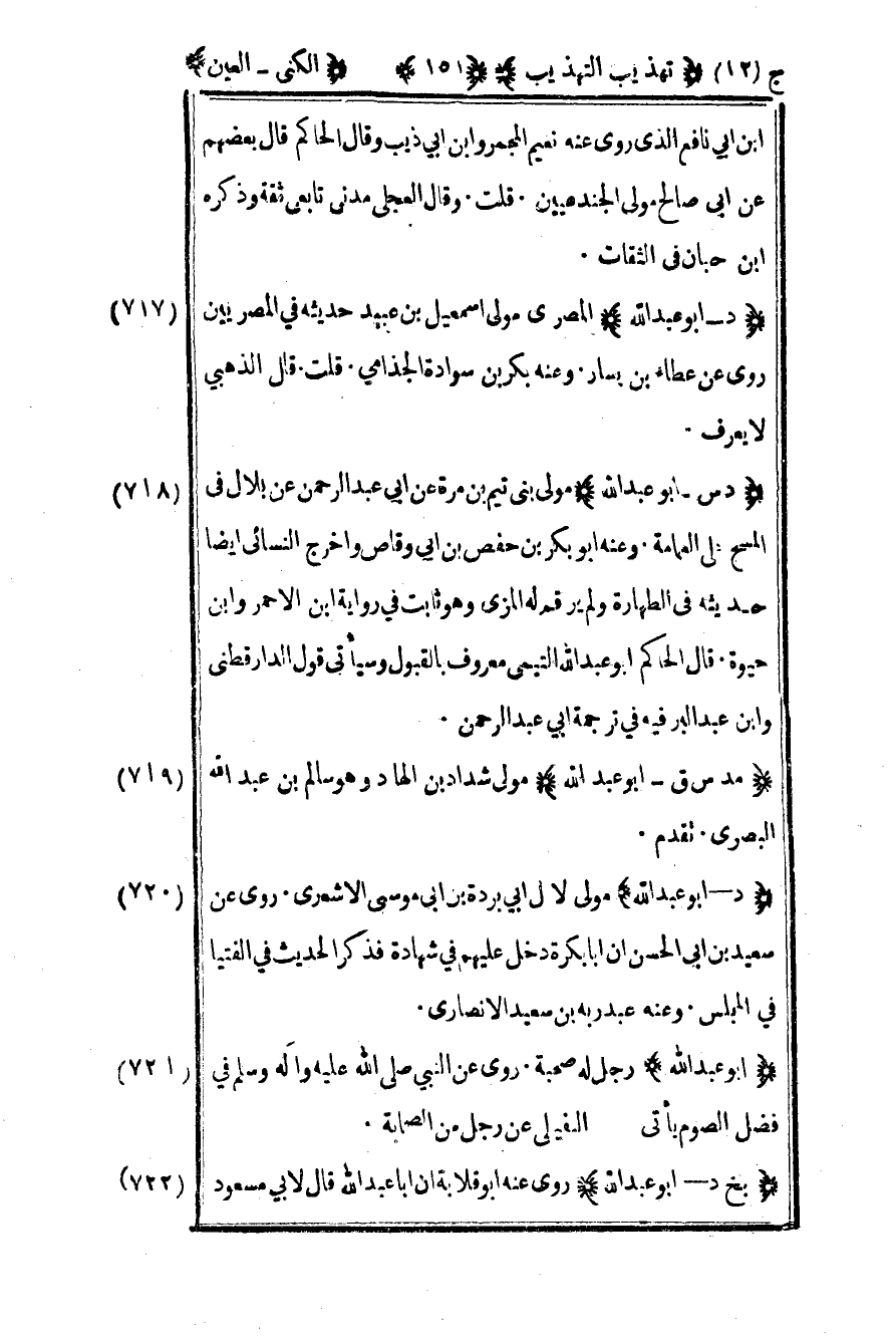 717- "د س - أبو عبد الله" مولى بني تميم بن مرة عن أبي عبد الرحمن عن بلال في المسح على العمامة وعنه أبو بكر بن حفص بن أبي وقاص وأخرج النسائي أيضا حديثه في الطهارة ولم يرقم له المزي وهو ثابت في رواية بن الأحمر وابن حيوة قال الحاكم أبو عبد الله التيمي معروف بالقبول وسيأتي قول الدارقطني وابن عبد البر فيه ترجمة أبي عبد الرحمن.