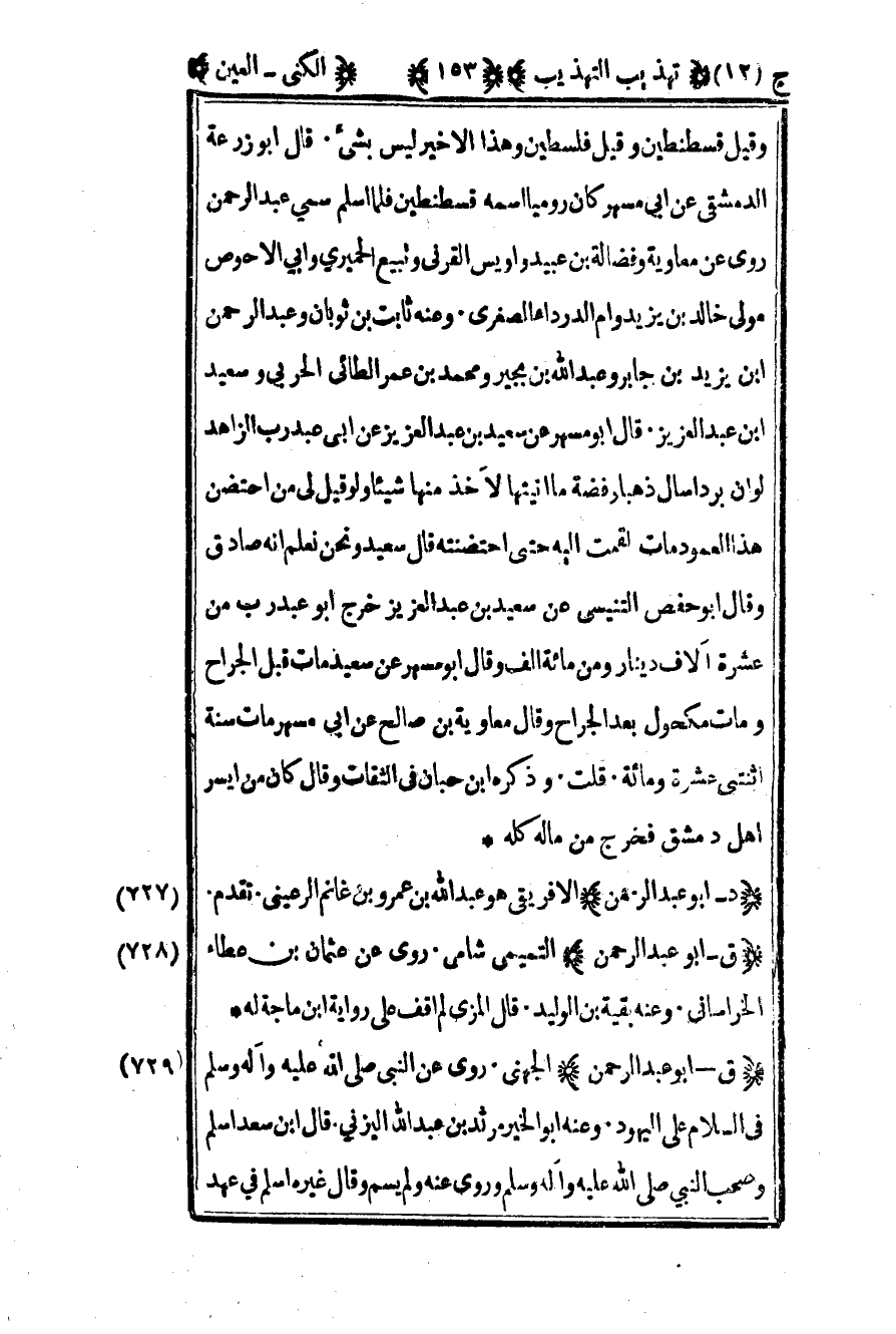 727- "ق - أبو عبد الرحمن" التميمي شامي روى عن عثمان بن عطاء الخراساني وعنه بقية بن الوليد قال المزي لم أقف على رواية بن ماجة له.