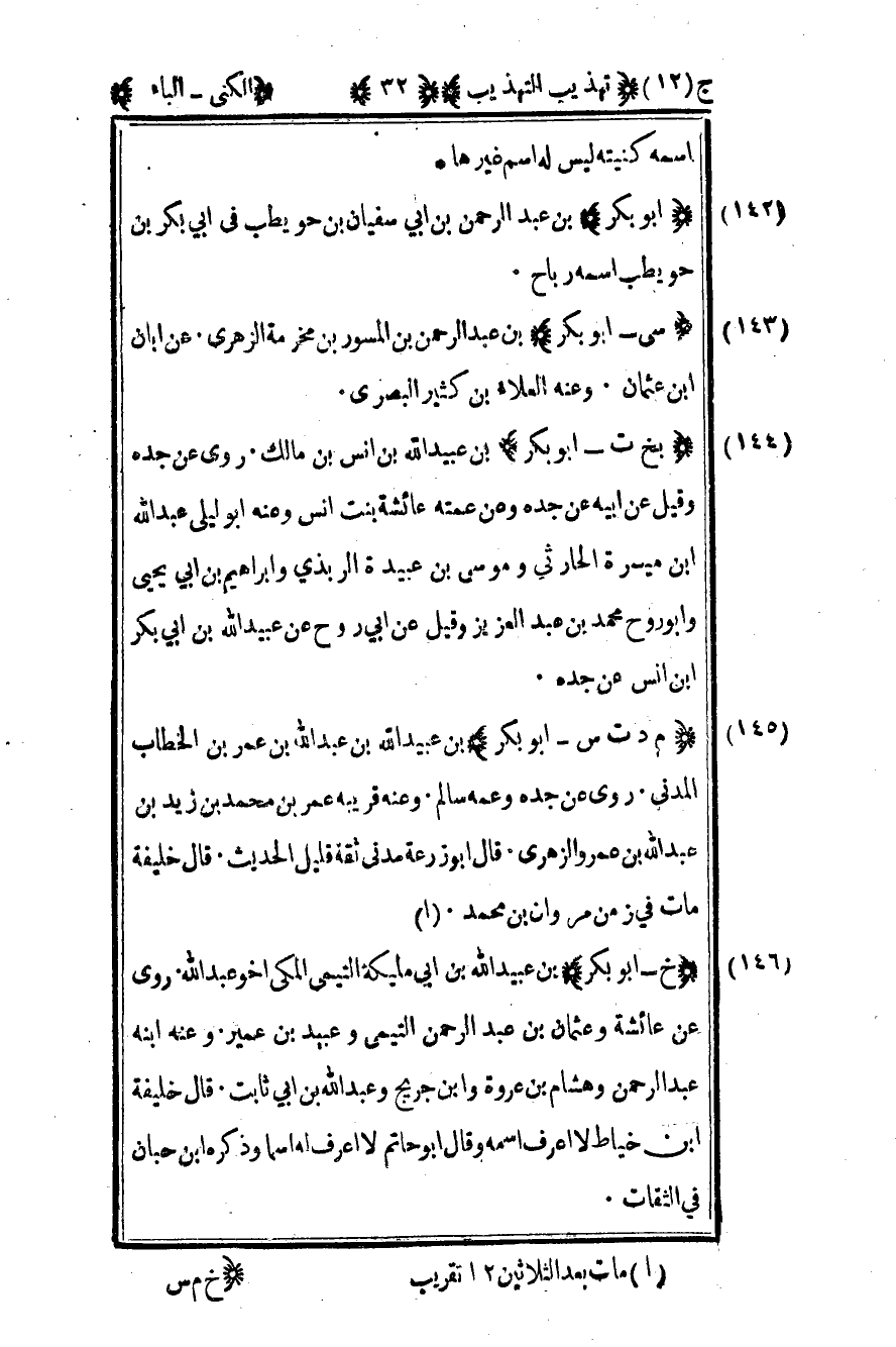145- "م د ت س - أبو بكر" بن عبيد الله بن عبد الله بن عمر بن الخطاب المدني روى عن جده وعمه سالم وعنه قريبه عمر بن محمد بن زيد بن عبد الله بن عمرو الزهري قال أبو زرعة مدني ثقة قليل الحديث قال خليفة مات في زمن مروان بن محمد.1