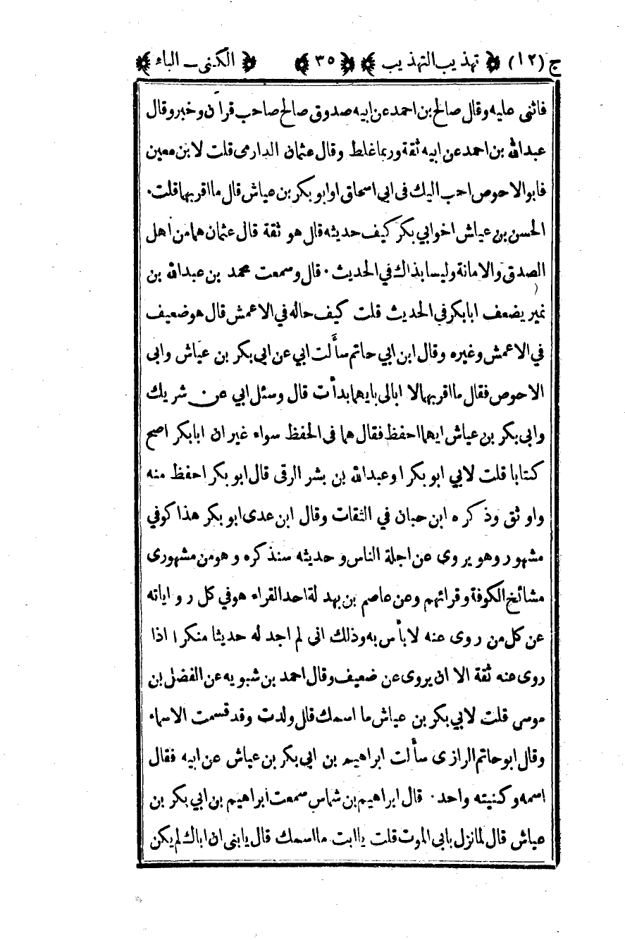 فأثنى عليه وقال صالح بن أحمد عن أبيه صدوق صالح صاحب قرآن وخبر وقال عبد الله بن أحمد عن أبيه ثقة وربما غلط وقال عثمان الدارمي قلت لابن معين فأبو الأحوص أحب إليك في أبي إسحاق وأبو بكر بن عياش قال ما أقربهما قلت الحسن بن عياش أخو أبي بكر كيف حديثه قال هو ثقة قال عثمان هما من أهل الصدق والأمانة وليسا بذاك في الحديث قال وسمعت محمد بن عبد الله بن نمير يضعف أبا بكر في الحديث قلت كيف حاله في الأعمش قال هو ضعيف في الأعمش وغيره وقال ابن أبي حاتم سألت أبي عن أبي بكر بن عياش وأبي الأحوص فقال ما أقربهما لا أبالي بأيهما بدأت قال وسئل أبي عن شريك وأبي بكر بن عياش أيهما أحفظ فقال هما في الحفظ سواء غير أن أبا بكر أصح كتابا قلت لأبي أبو بكرا وعبد الله بن بشر الرقي قال أبو بكر أحفظ منه وأوثق وذكره ابن حبان في الثقات وقال ابن عدي أبو بكر هذا كوفي مشهور وهو يروي عن أجلة الناس وحديثه سنذكره وهو من مشهوري مشائخ الكوفة وقرائهم وعن عاصم بن بهدلة أحد القراء هو في كل رواياته عن كل من روى عنه لا بأس به وذلك إني لم أجد له حديثا منكرا إذا روى عنه ثقة إلا أن يروي عن ضعيف وقال أحمد بن شبويه عن الفضل بن موسى قلت لأبي بكر بن عياش ما اسمك قال ولدت وقد قسمت الأسماء وقال أبو حاتم الرازي سألت إبراهيم بن أبي بكر بن عياش عن أبيه فقال اسمه وكنيته واحد قال إبراهيم بن شماس سمعت إبراهيم بن أبي بكر بن عياش قال لما نزل بأبي الموت قلت يا أبت ما اسمك قال يا بني أن أباك لم يكن