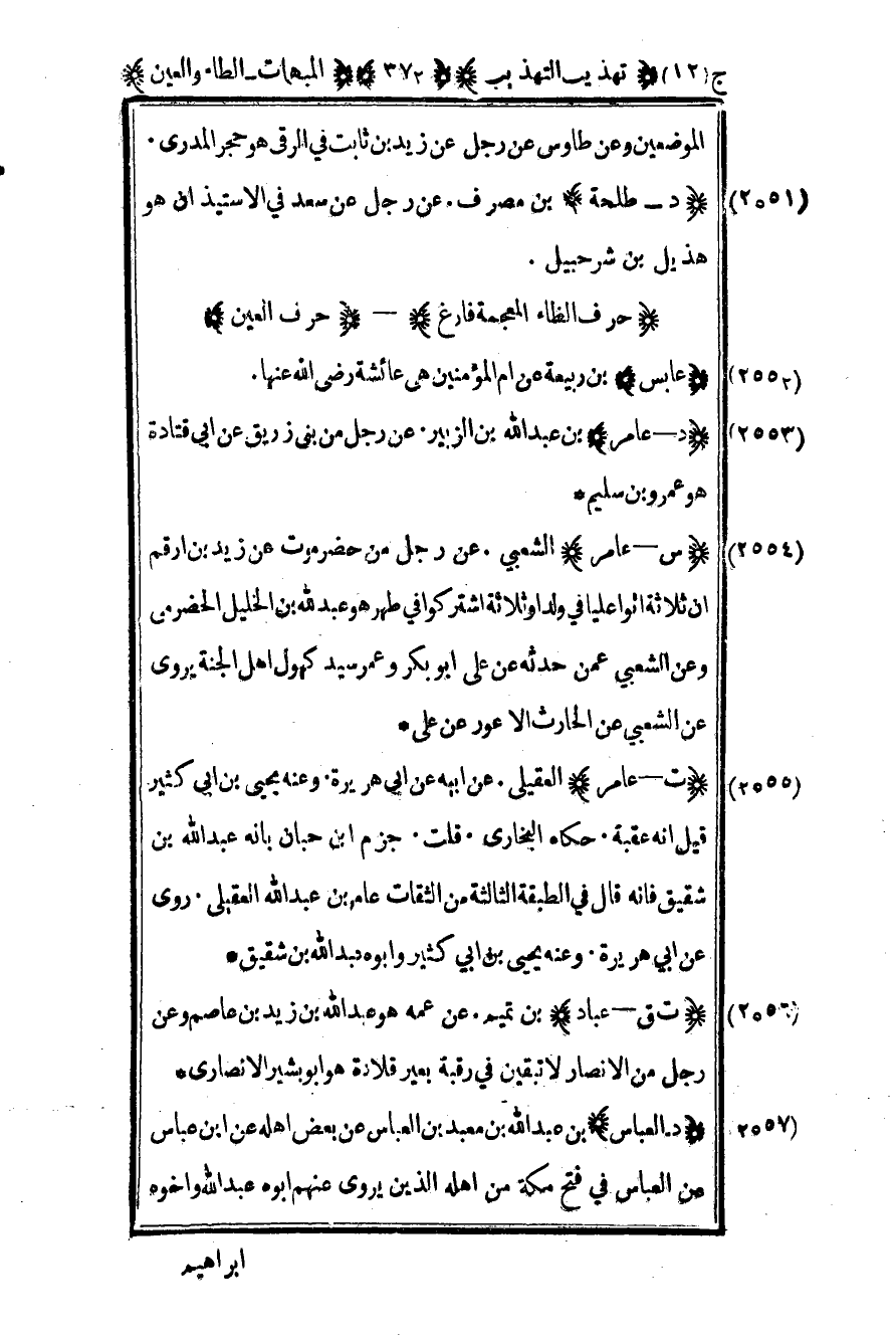 2552 - "س - عامر" الشعبي عن رجل من حضرموت عن زيد بن أرقم أن ثلاثة أتوا عليا في ولد أو ثلاثة اشتركوا في طهر هو عبد الله بن الخليل الحضرمي وعن الشعبي عمن حدثه عن علي أبو بكر وعمر سيدا كهول أهل الجنة يروي عن الشعبي عن الحارث الأعور عن علي.