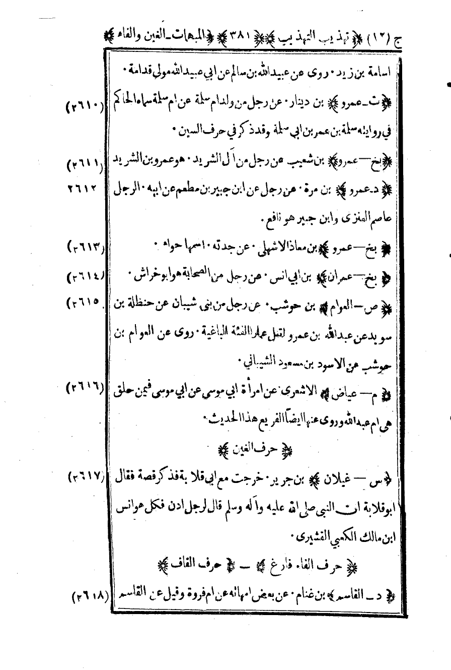 2613 - "ص - العوام" بن حوشب عن رجل من بني شيبان عن حنظلة بن سويد عن عبد الله بن عمرو تقتل عمار الفئة الباغية روى عن العوام بن حوشب عن الأسود بن مسعود الشيباني.
