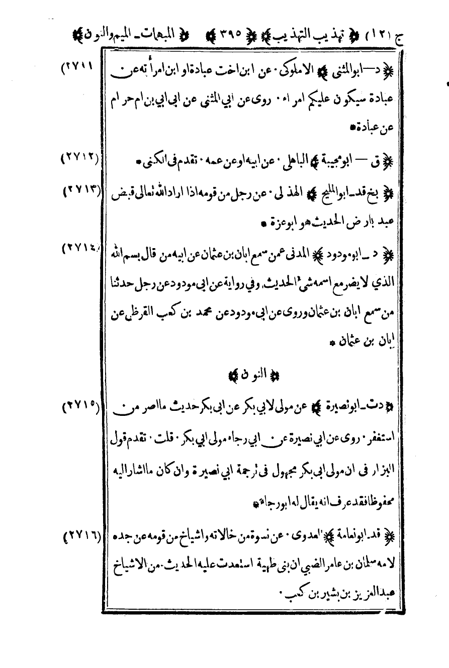 2715 - "قد أبو نعامة" العدوي عن نسوة من خالاته واشياخ من قومه عن جده لأمه سلمان بن عامر الضبي أن بني طهية استعدت عليه الحديث من الأشياخ عبد العزيز بن بشير بن كعب.