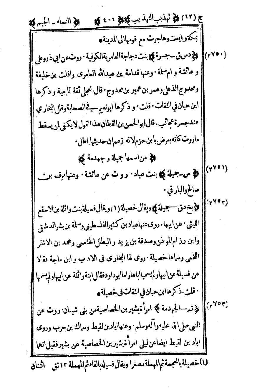 2750 - "س - جميلة" بنت عباد روت عن عائشة وعنها عوف بن صالح والبارقي.