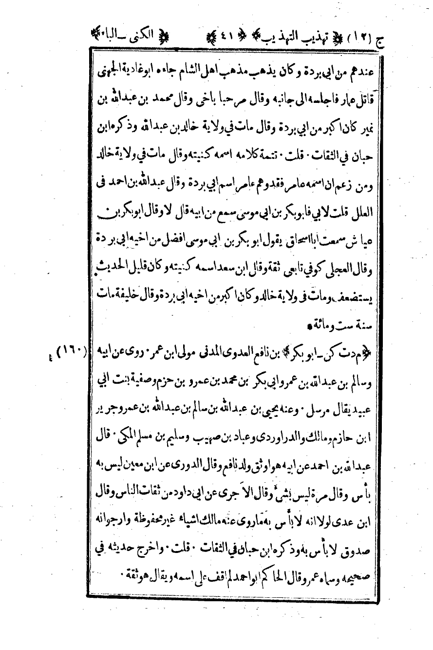 160- "م د ت كن - أبو بكر" بن نافع العدوي المدني مولى بن عمر روى عن أبيه وسالم بن عبد الله بن عمر وأبي بكر بن محمد بن عمرو بن حزم وصفية بنت أبي عبيد يقال مرسل وعنه يحيى بن عبد الله بن سالم بن عبد الله بن عمر وجرير بن حازم ومالك والداروردي وعباد بن صهيب وسليم بن مسلم المكي قال عبد الله بن أحمد عن أبيه هو أوثق ولد نافع وقال الدوري عن ابن معين ليس به بأس وقال مرة ليس بشيء وقال الآجري عن أبي داود من ثقات الناس وقال ابن عدي لولا أنه لا بأس به ما روى عنه مالك أشياء غير محفوظه وأرجو أنه صدوق لا بأس به وذكره ابن حبان في الثقات قلت وأخرج حديثه في صحيحه وسماه عمر وقال الحاكم أبو أحمد لم أقف على اسمه ويقال هو ثقة.