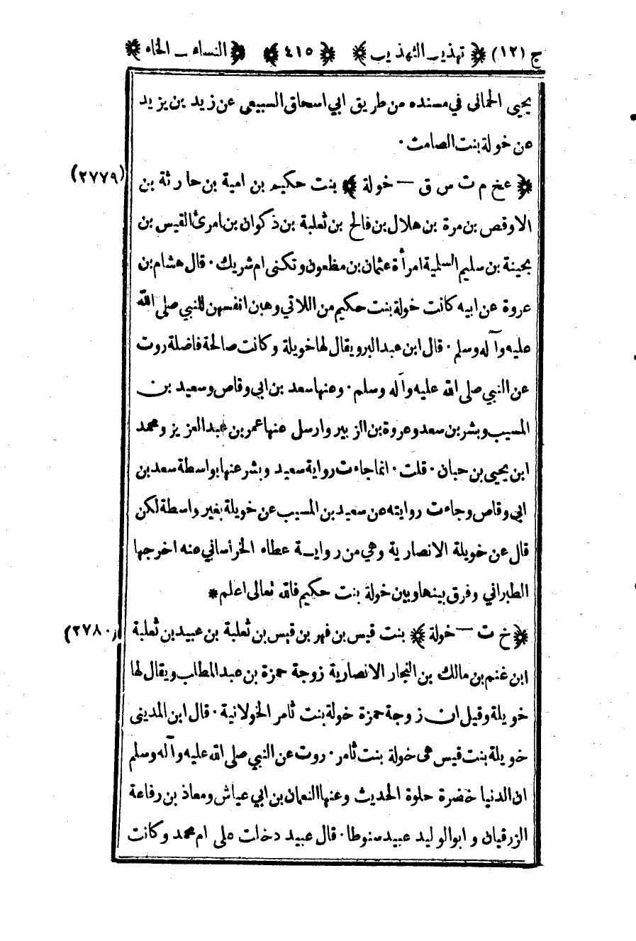 2778 - "عخ م ت س ق - خولة" بنت حكيم بن أمية بن حارثة بن الأوقص بن مرة بن هلال بن فالح بن ثعلبة بن ذكوان بن امرئ القيس بن بحينة بن سليم السلمية امرأة عثمان بن مظعون وتكنى أم شرك قال هشام بن عروة عن أبيه كانت خولة بنت حكيم من اللاتي وهبن أنفسهن للنبي صلى الله عليه وآله وسلم قال ابن عبد البر ويقال لها خويلة وكانت صالحة فاضلة روت عن النبي صلى الله عليه وآله وسلم وعنها سعد بن أبي وقاص وسعيد بن المسبب وبشر بن سعد وعروة بن الزبير وأرسل عنها عمر بن عبد العزيز ومحمد بن يحيى بن حبان قلت إنما جاءت رواية سعيد وبشر عنها بواسطة سعد بن أبي وقاص وجاءت روايته عن سعيد بن المسيب عن خويلة بغير واسطة لكن قال عن خويلة الأنصارية وهي من رواية عطاء الخراساني عنه أخرجها الطبراني وفرق بينها وبين خولة بنت حكيم فالله تعالى أعلم.