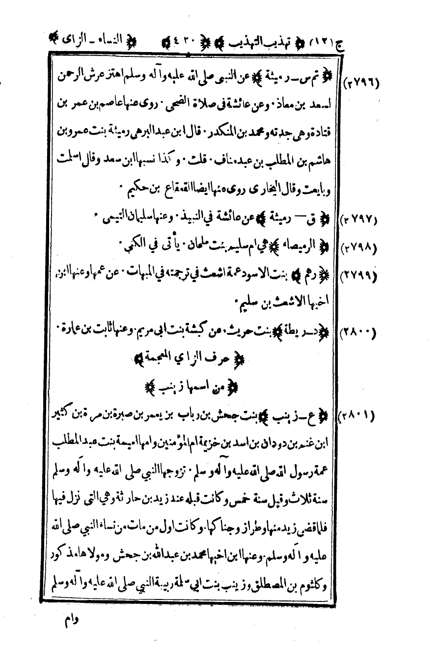 2800 - "ع - زينب" بنت جحش بن رباب بن يعمر بن صبرة بن مرة بن كثير بن غنم بن دودان بن أسد بن خزيمة أم المؤمنين وأمها أميمة بنت عبد المطلب عمة رسول الله صلى الله عليه وآله وسلم تزوجها النبي صلى الله عليه وآله وسلم سنة ثلاث وقيل سنة خمس وكانت قبله عند زيد بن حارثة وهي التي نزل فيها فلما قضى زيد منها وطرا زوجناكها وكانت أول من مات من نساء النبي صلى الله عليه وآله وسلم وعنها بن أخيها محمد بن عبد الله بن جحش ومولاها مذكور وكلثوم بن المصطلق وزينب بنت أبي سلمة ربيبة النبي صلى الله عليه وآله وسلم