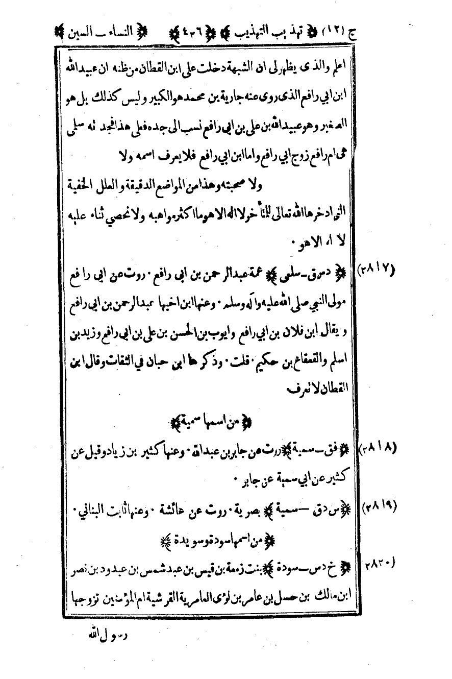 2816 - "د س ق - سلمى" عمة عبد الرحمن بن أبي رافع روت عن أبي رافع مولى النبي صلى الله عليه وآله وسلم وعنها بن أخيها عبد الرحمن بن أبي رافع ويقال ابن فلان بن أبي رافع وأيوب بن الحسن بن علي بن أبي رافع وزيد بن أسلم والقعقاع بن حكيم قلت وذكرها بن حبان في الثقات وقال ابن القطان لا تعرف.