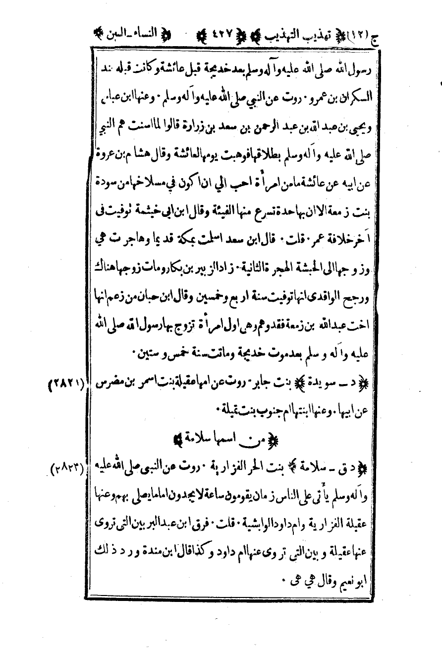 2820 - "د - سويدة" بنت جابر روت عن أمها عقيلة بنت أسمر بن مضرس عن أبيها وعنها ابنتها أم جنوب بنت تميلة.
