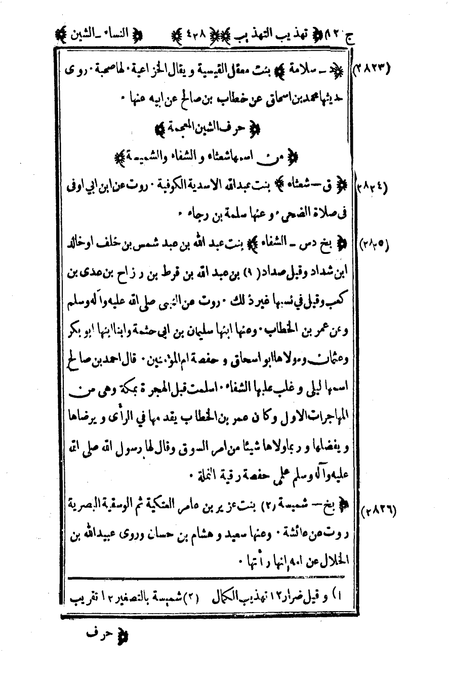 2823 - "ق - شعثاء" بنت عبد الله الأسديه الكوفية روت عن ابن أبي أوفى في صلاة الضحى وعنها سلمة بن رجاء.