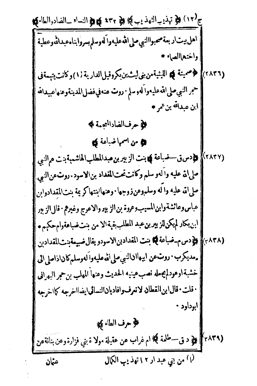 2836 - "د س ق - ضباعة" بنت الزبير بن عبد المطلب الهاشمية بنت عم النبي صلى الله عليه وآله وسلم وكانت تحت المقداد بن الأسود روت عن النبي صلى الله عليه وآله وسلم وعن زوجها وعنها ابنتها كريمة بنت المقداد وابن عباس وعائشة وابن المسيب وعروة بن الزبير والأعرج وغيرهم قال الزبير بن بكار لم يكن للزبير بن عبد المطلب بقية إلا من بنت ضباعة وأم حكيم.