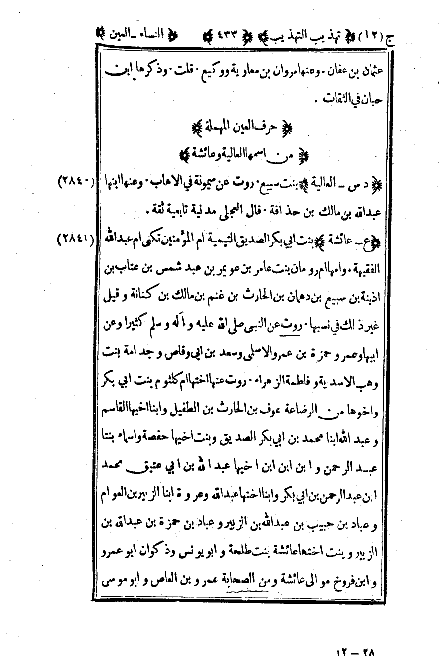 2840 - "ع - عائشة" بنت أبي بكر الصديق التيمية أم المؤمنين تكنى أم عبد الله الفقيهة وأمها أم رومان بنت عامر بن عويمر بن عبد شمس بن عتاب بن اذينه بن سبيع بن دهمان بن الحارث بن غنم بن مالك بن كنانه وقيل غير ذلك في نسبها روت عن النبي صلى الله عليه وآله وسلم كثيرا وعن أبيها وعمر وحمزة بن عمرو الأسلمي وسعد بن أبي وقاص وجد أمة بنت وهب الاسديه وفاطمه الزهراء روت عنها أختها أم كلثوم بنت أبي بكر وأخوها من الرضاعة عوف بن الحارث بن الطفيل وابنا أخيها القاسم وعبد الله ابنا محمد بن أبي بكر الصديق وبنت أخيها حفصة وأسماء بنتا عبد الرحمن وابن بن بن أخيها عبد الله بن أبي عتيق محمد بن عبد الرحمن بن أبي بكر وابنا أختها عبد الله وعروة ابنا الزبير بن العوام وعباد بن حبيب بن عبد الله بن الزبير وعباد بن حمزة بن عبد الله بن الزبير وبنت أختها عائشة بنت طلحة وأبو يونس وذكوان أبو عمرو وابن فروخ موالي عائشة ومن الصحابة عمرو بن العاص وأبو موسى
