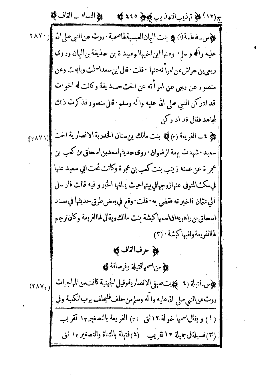 2871 - "س - قتيلة1" بنت صيفي الأنصارية وقيل الجهنية كانت من المهاجرات روت عن النبي صلى الله عليه وآله وسلم "من حلف فليحلف برب الكعبة" وفي