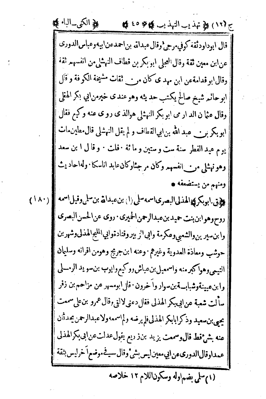 180- "ق - أبو بكر" الهذلي البصري اسمه سلمى1 بن عبد الله بن سلمى وقيل اسمه روح وهو بن بنت حميد بن عبد الرحمن الحميري روى عن الحسن البصري وابن سيرين والشعبي وعكرمة وأبي الزبير وقتادة وأبي المليح الهذلي وشهر بن حوشب ومعاذة العدوية وغيرهم وعنه بن جريج وهو من أقرانه وسليمان التيمي وهو أكبر منه وإسماعيل بن عياش ووكيع وأيوب بن سويد الرملي وابن عيينة وشبابة بن سوار وآخرون قال أبو مسهر عن مزاحم بن زفر سألت شعبة عن أبي بكر الهذلي فقال دعني لألقى وقال عمرو بن علي سمعت يحيى بن سعيد وذكر أبا بكر الهذلي فلم يرضه ولم أسمعه ولا عبد الرحمن يحدثان عنه بشيء قط قال وسمعت يزيد بن زريع يقول عدلت عن أبي بكر الهذلي عمدا وقال الدوري عن أبي معين ليس بشيء وقال في موضع آخر ليس بثقة.