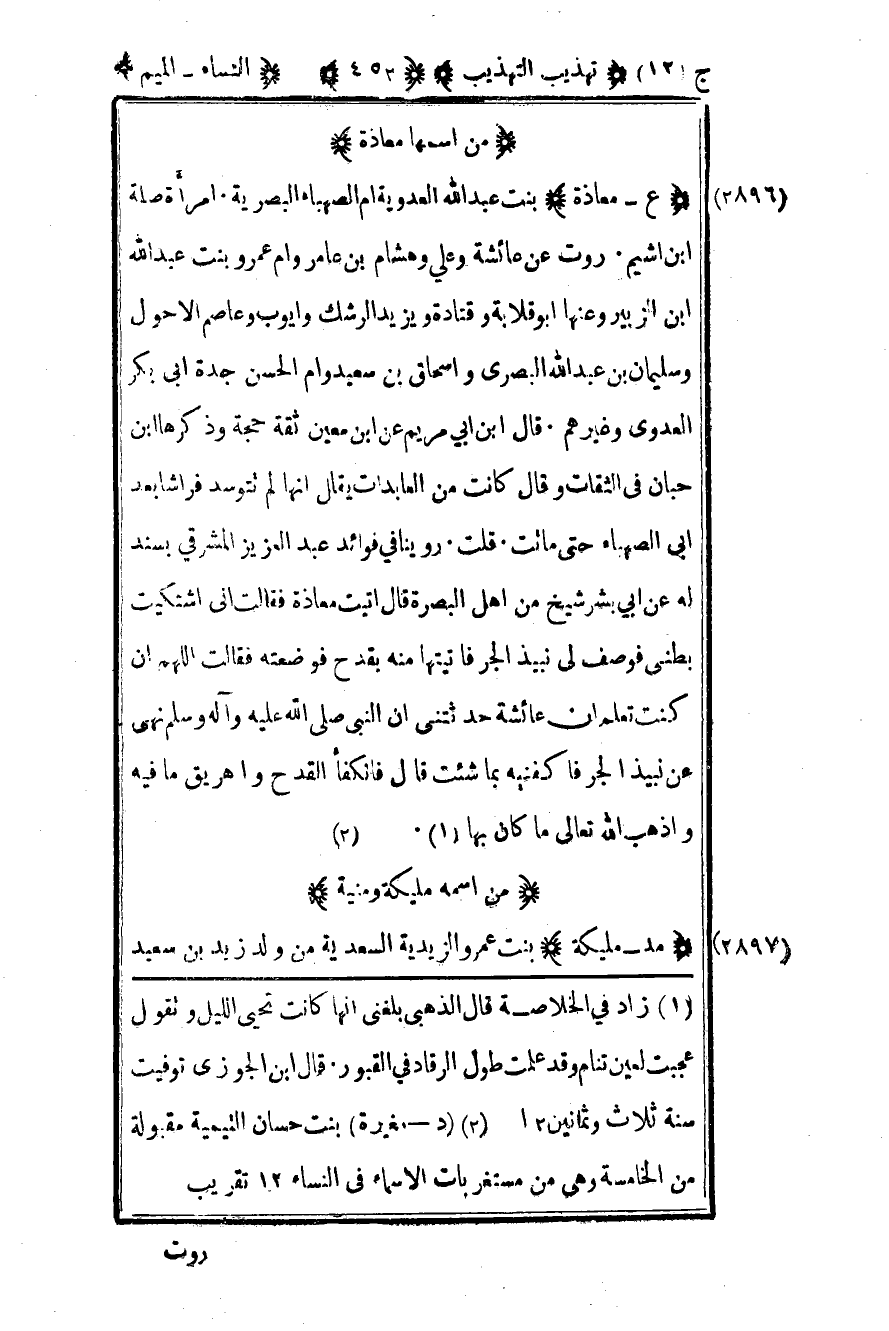 2895 - "ع الستة معاذة بنت عبد الله العدوية أم الصهباء البصرية امرأة صلة بن أشيم روت عن عائشة وعلي وهشام بن عامر وأم عمرو بنت عبد الله بن الزبير وعنها أبو قلابة وقتادة ويزيد الرشك وأيوب وعاصم الأحول وسليمان بن عبد الله البصري وإسحاق بن سعيد وأم الحسن جدة أبي بكر العدوي وغيرهم قال ابن أبي مريم عن ابن معين ثقة حجة وذكرها بن حبان في الثقات وقال كانت من العابدات يقال أنها لم تتوسد فراشا بعد أبي الصهباء حتى ماتت قلت روينا في فوائد عبد العزيز المشرقي بسند له عن أبي بشر شيخ من أهل البصرة قال أتيت معاذ فقالت إني اشتكيت بطني فوصف لي نبيذ الجر فأتيتها منه بقدح فوضعته فقالت اللهم إن كنت تعلم أن عائشة حدثتني أن النبي صلى الله عليه وآله وسلم نهى عن نبيذ الجر فاكفنيه بما شئت قال فانكفأ القدح واهريق ما فيه وأذهب الله تعالى ما كان بها.1 2