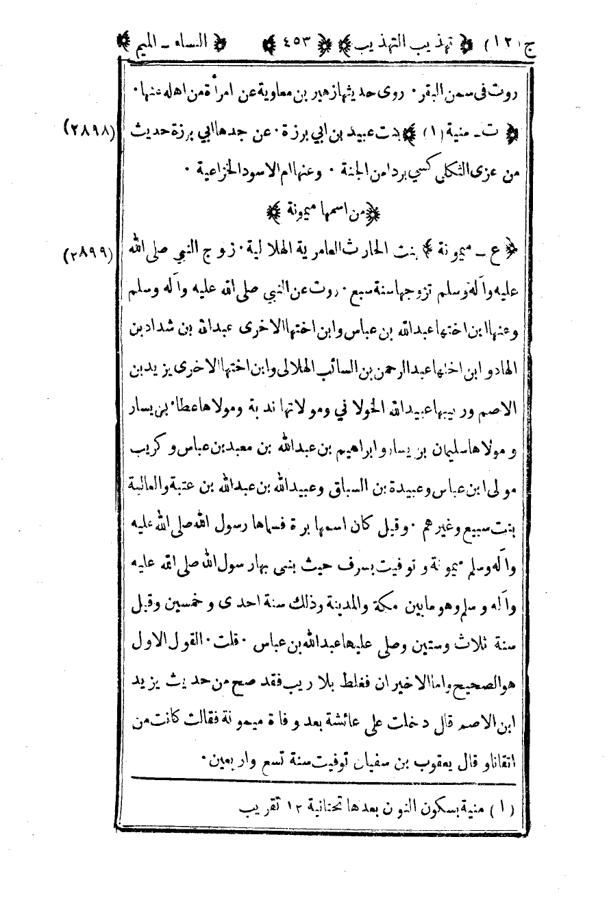 2898 - "ع - ميمونة" بنت الحارث العامرية الهلالية زوج النبي صلى الله عليه وآله وسلم تزوجها سنة سبع روت عن النبي صلى الله عليه وآله وسلم وعنها بن أختها عبد الله بن عباس وابن أختها الأخرى عبد الله بن شداد بن الهاد وابن أختها عبد الرحمن بن السائب الهلالي وابن أختها الأخرى يزيد بن الأصم وربيبها عبيد الله الخولاني ومولاتها ندبة ومولاها عطاء بن يسار ومولاها سليمان بن يسار وإبراهيم بن عبد الله بن معبد بن عباس وكريب مولى بن عباس وعبيدة بن السباق وعبيد الله بن عبد الله بن عتبة والعالية بنت سبيع وغيرهم وقيل كان اسمها برة فسماها رسول الله صلى الله عليه وآله وسلم ميمونة وتوفيت بسرف حيث بني بها رسول الله صلى الله عليه وآله وسلم وهو ما بين مكة والمدينة وذلك سنة إحدى وخمسين وقيل سنة ثلاث وستين وصلى عليه عبد الله بن عباس قلت القول الأول هو الصحيح وأما الأخيران فغلط بلا ريب فقد صح من حديث يزيد بن الأصم قال دخلت على عائشة بعد وفاة ميمونة فقالت كانت من اتقانا وقال يعقوب بن سفيان توفيت سنة تسع وأربعين.