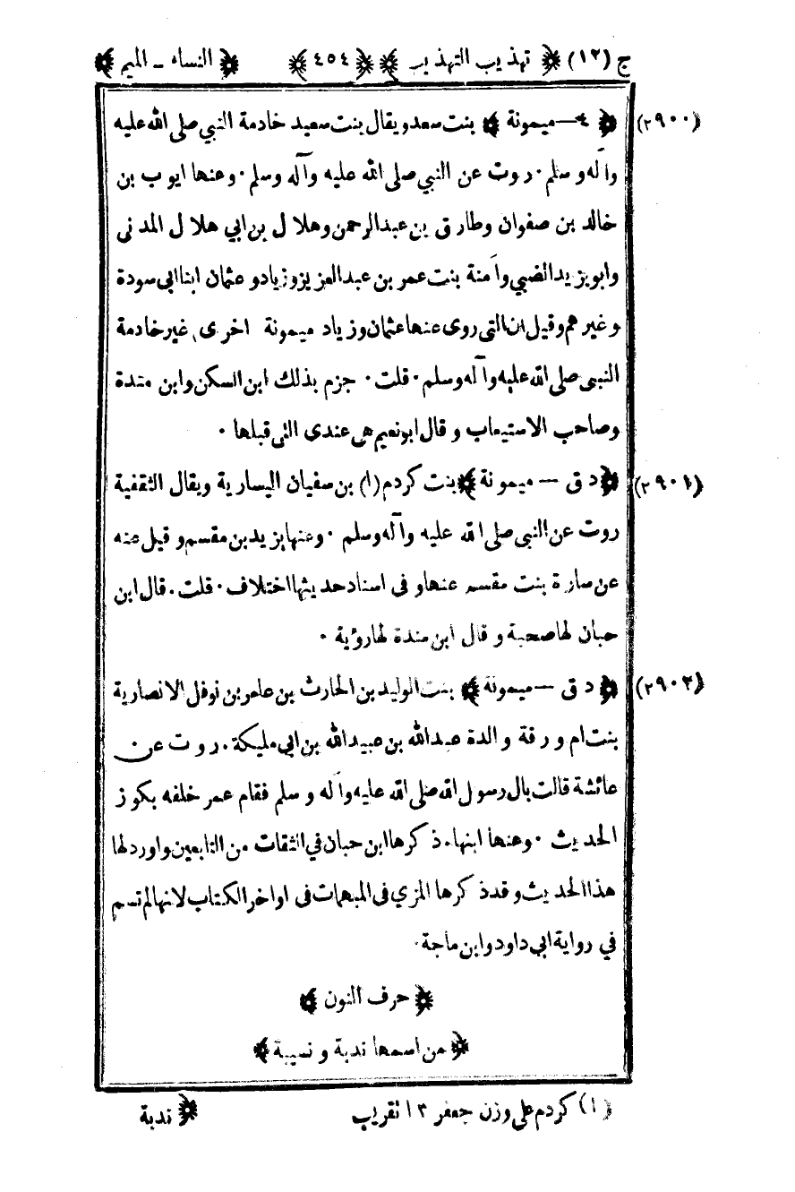 2901 - "د ق - ميمونة" بنت الوليد بن الحارث بن عامر بن نوفل الأنصارية بنت أم ورقة والدة عبد الله بن عبيد الله بن أبي مليكة روت عن عائشة قالت بال رسول الله صلى الله عليه وآله وسلم فقام عمر خلفه بكوز الحديث وعنها ابنها ذكرها بن حبان في الثقات من التابعين وأورد لها هذا الحديث وقد ذكرها المزي في المبهمات في أواخر الكتاب لأنها لم تسم في رواية أبي داود وابن ماجة.