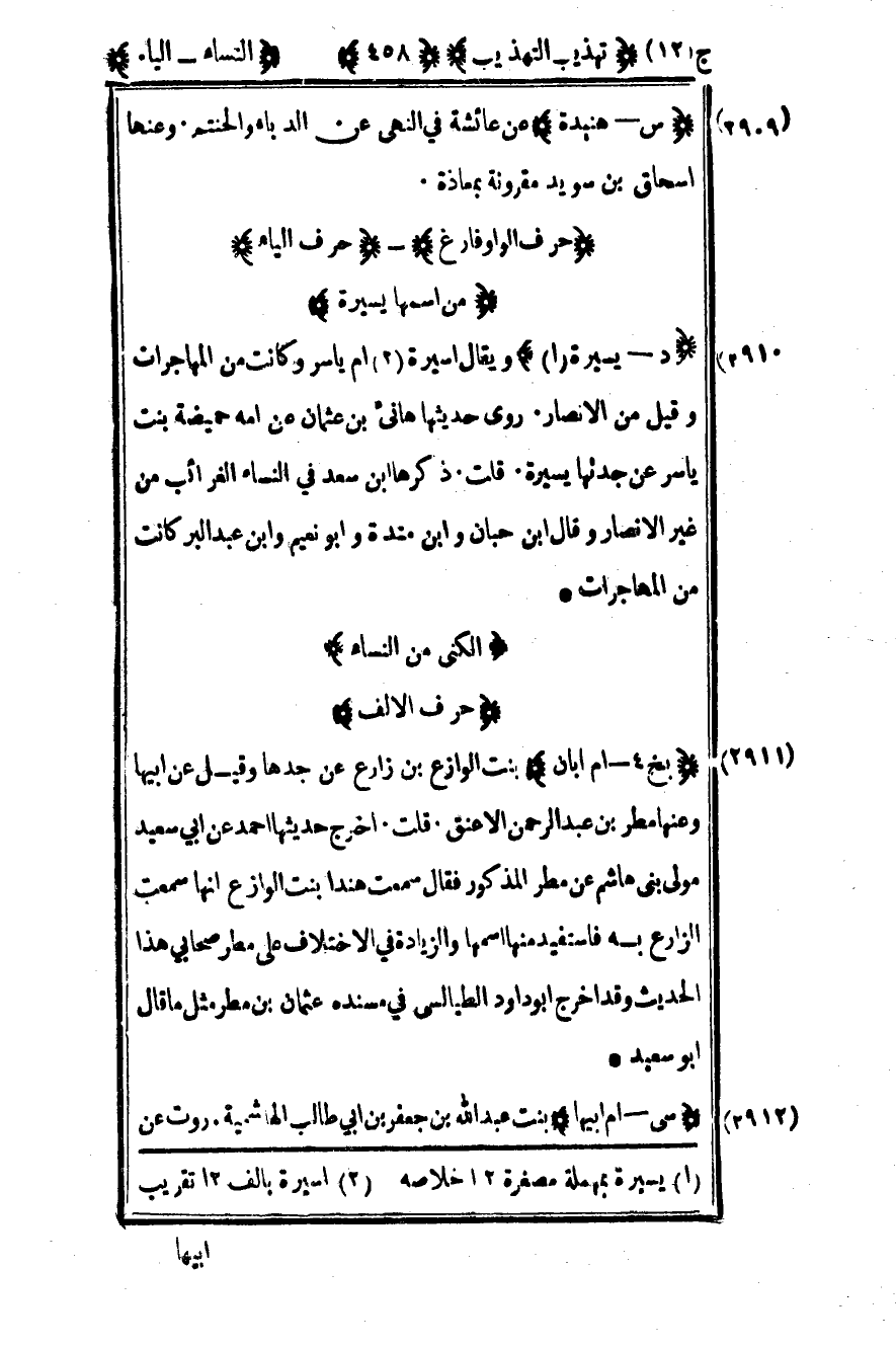 2909 - "د - يسيرة1" ويقال أسيرة2 أم ياسر وكانت من المهاجرات وقيل من الأنصار روى حديثها هانئ بن عثمان عن أمه حميضة بنت ياسر عن جدتها يسيرة قلت ذكرها بن سعد في النساء الغرائب من غير الأنصار وقال ابن حبان وابن مندة وأبو نعيم وابن عبد البر كانت من المهاجرات.
