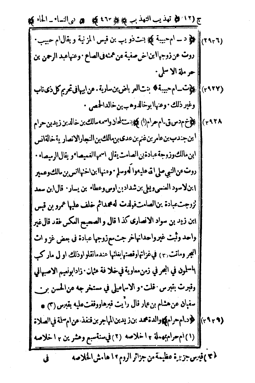 2927 - "خ م د س ق - أم حرام1" بنت ملحان واسمه مالك بن خالد بن زيد بن حرام بن جندب بن عامر بن غنم بن عدي بن مالك بن النجار الأنصارية خالة أنس بن مالك وزوجة عبادة بن الصامت يقال اسمها الغميصاء ويقال الرميصاء روت عن النبي صلى الله عليه وآله وسلم وعنها بن أختها أنس بن مالك وعمير بن الأسود العنسي ويعلى بن شداد بن أوس وعطاء بن يسار قال ابن سعد تزوجت عبادة بن الصامت فولدت له محمدا ثم خلف عليها عمرو بن قيس بن زيد بن سواد الأنصاري كذا قال والصحيح العكس فقد قال غير واحد وثبت غير واحد أنها خرجت مع زوجها عبادة في بعض غزوات البحر وماتت2 في غزاتها وقصتها بغلتها عندما نقلوا وذلك أول ما ركب المسلمون في البحر في زمن معاوية في خلافة عثمان زاد أبو نعيم الأصبهاني وقبرت بقبرس قلت والإسماعيلي في مستخرجه عن الحسن بن سفيان عن هشام بن عمار قال رأيت قبرها ووقفت عليه بقبرس3.