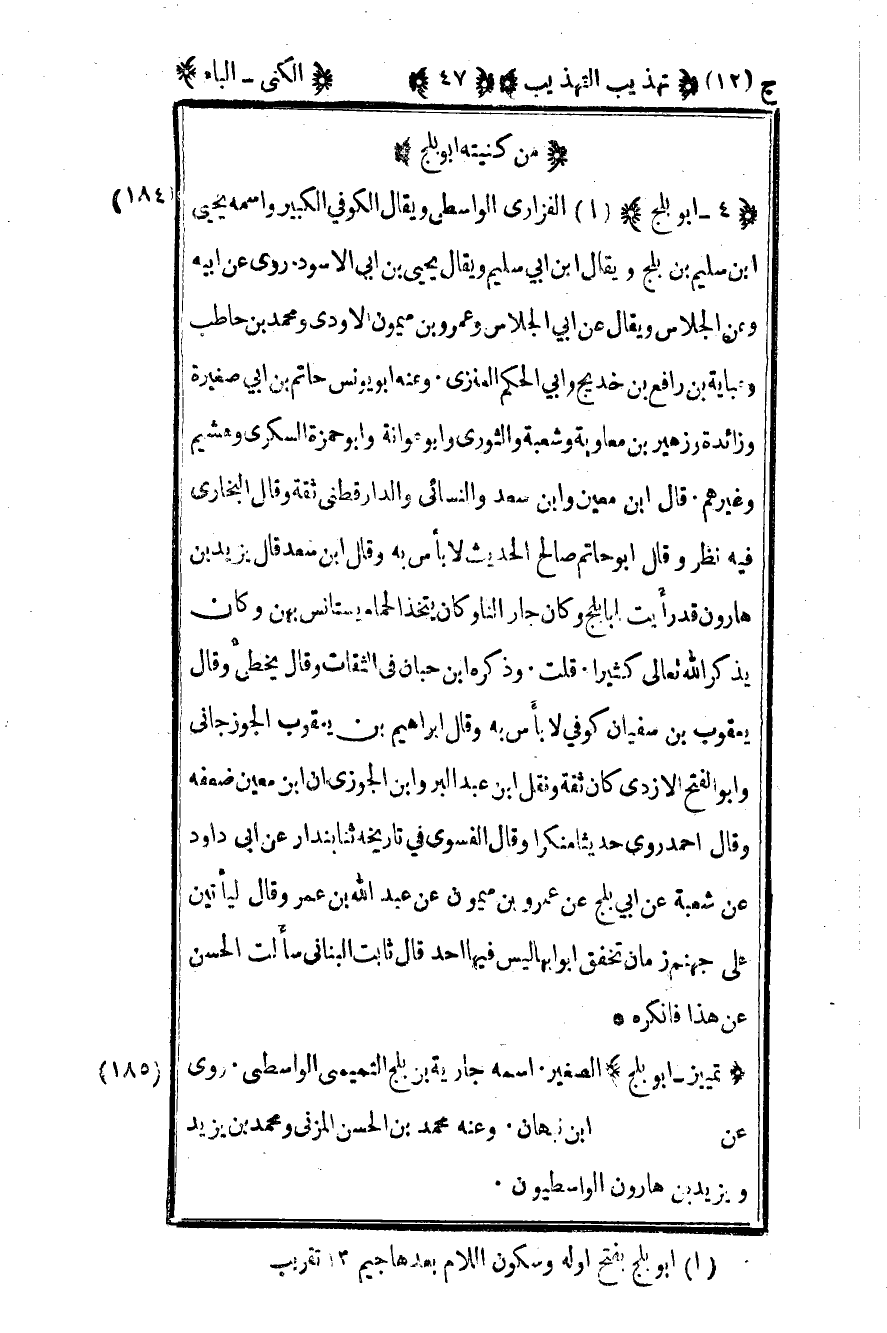 185- "تمييز- أبو بلج" الصغير اسمه جارية بن بلج التميمي الواسطي روى عن ابن نبهان وعنه محمد بن الحسن المزني ومحمد بن يزيد ويزيد بن هارون الواسطيون.