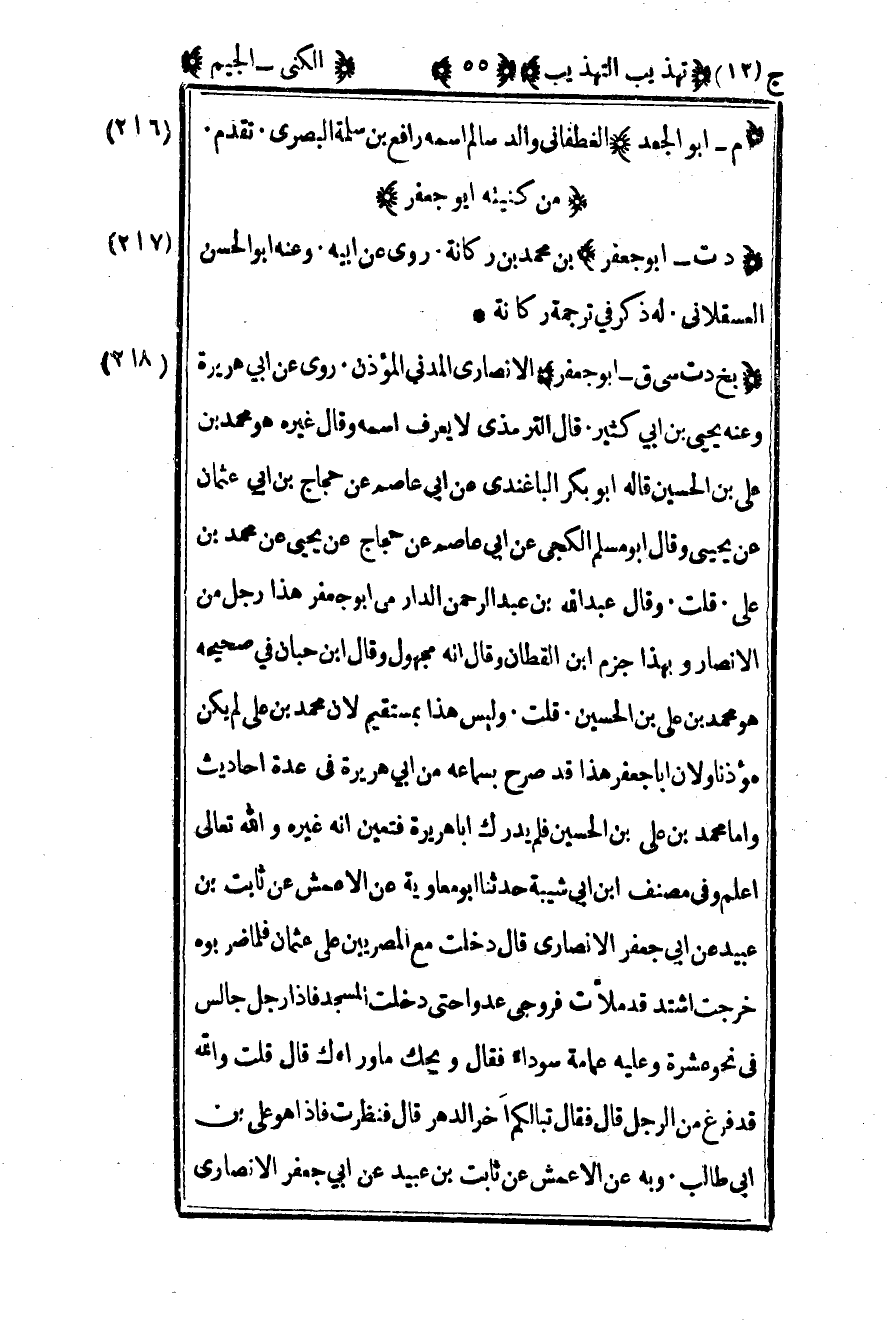 218- "بخ د ت سي ق - أبو جعفر" الأنصاري المدني المؤذن روى عن أبي هريرة وعنه يحيى بن أبي كثير قال الترمذي لا يعرف اسمه وقال غيره هو محمد بن علي بن الحسين قاله أبو بكر الباغندي عن أبي عاصم عن حجاج بن أبي عثمان عن يحيى وقال أبو مسلم الكجي عن أبي عاصم عن حجاج عن يحيى عن محمد بن علي قلت وقال عبد الله بن عبد الرحمن الدارمي أبو جعفر هذا رجل من الأنصار وبهذا جزم بن القطان وقال إنه مجهول وقال ابن حبان في صحيحه هو محمد بن علي بن الحسين قلت وليس هذا بمستقيم لأن محمد بن علي لم يكن مؤذنا ولأن أبا جعفر هذا قد صرح بسماعه من أبي هريرة في عدة أحاديث وأما محمد بن علي بن الحسين فلم يدرك أبا هريرة فتعين أنه غيره والله تعالى أعلم وفي مصنف بن أبي شيبة حدثنا أبو معاوية عن الأعمش عن ثابت بن عبيد عن أبي جعفر الأنصاري قال دخلت مع المصريين على عثمان فلما ضربوه خرجت أشتد قد ملأت فروجي عدوا حتى دخلت المسجد فإذا رجل جالس في نحو عشرة وعليه عمامة سوداء فقال ويحك ما وراءك قال قلت والله قد فرغ من الرجل قال فقال تبا لكم آخر الدهر قال فنظرت فإذا هو علي بن أبي طالب وبه عن الأعمش عن ثابت بن عبيد عن أبي جعفر الأنصاري
