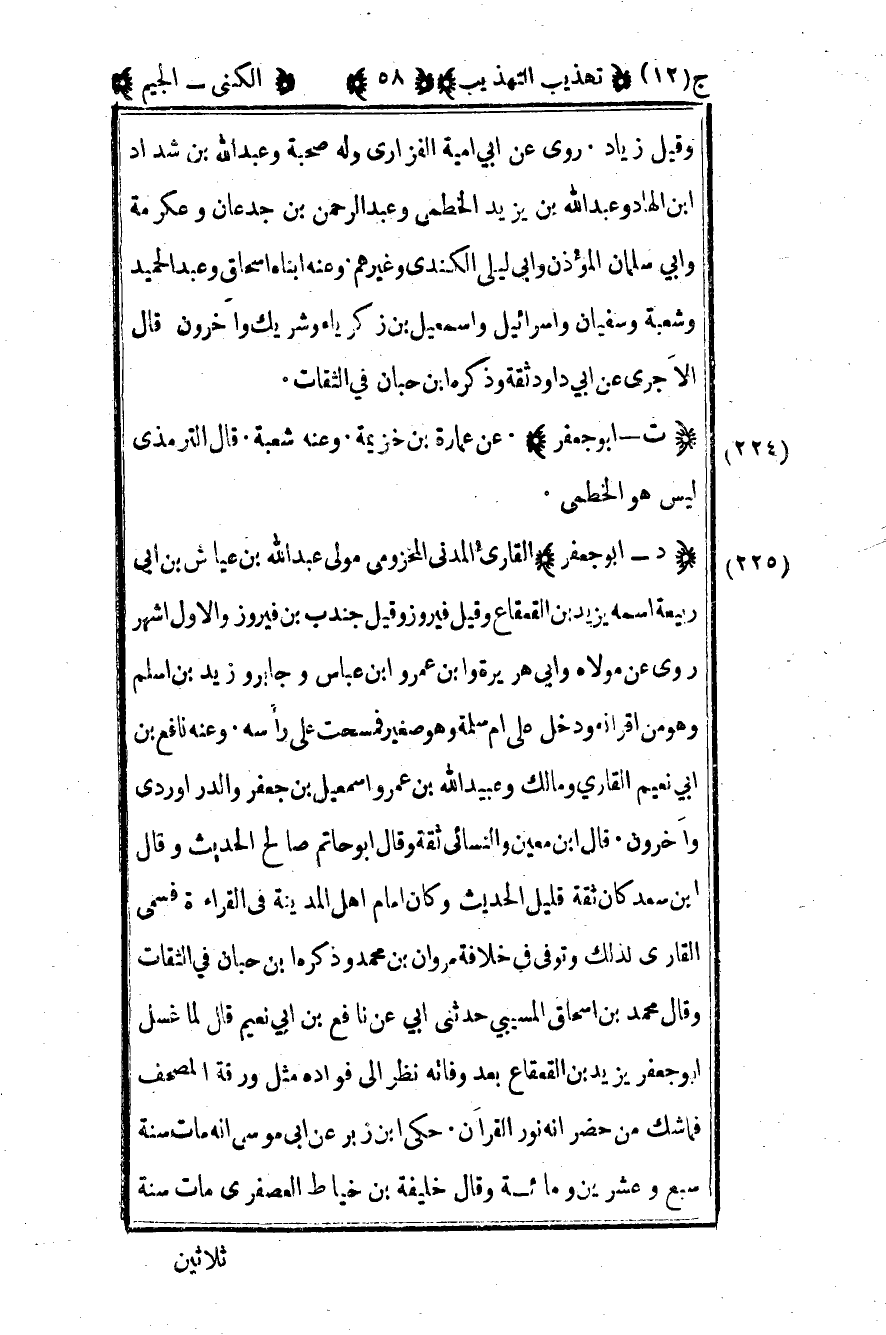 225- "د - أبو جعفر" القارئ المدني المخزومي مولى عبد الله بن عياش بن أبي ربيعة اسمه يزيد بن القعقاع وقيل فيروز وقيل جندب بن فيروز والأول أشهر روى عن مولاه وأبي هريرة وابن عمر وابن عباس وجابر وزيد بن أسلم وهو من أقرانه ودخل على أم سلمة وهو صغير فمسحت على رأسه وعنه نافع بن أبي نعيم القاري ومالك وعبيد الله بن عمر وإسماعيل بن جعفر والداروردي وآخرون قال ابن معين والنسائي ثقة وقال أبو حاتم صالح الحديث وقال ابن سعد كان ثقة قليل الحديث وكان إمام أهل المدينة في القراءة فسمى القاري لذلك وتوفي في خلافة مروان بن محمد وذكره ابن حبان في الثقات وقال محمد بن إسحاق المسيبي حدثني أبي عن نافع بن أبي نعيم قال لما غسل أبو جعفر يزيد بن القعقاع بعد وفاته نظر إلى فواده مثل ورقة المصحف فما شك من أنه نور القرآن حكى بن زبر عن أبي موسى أنه مات سنة سبع وعشرين ومائة وقال خليفة بن خياط العصفري مات سنة