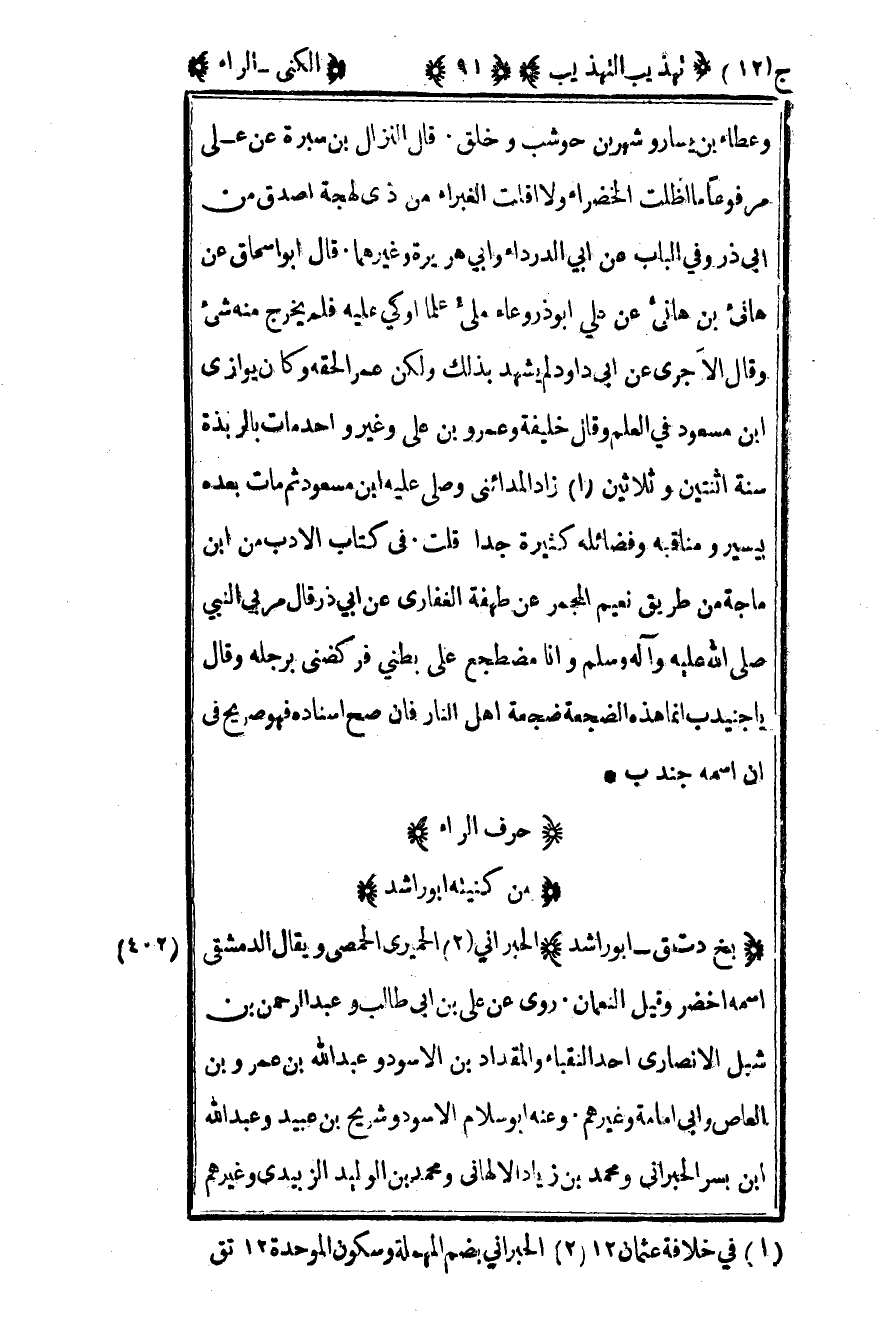 402- "بخ د ت ق - أبو راشد" الحبراني1 الحميري الحمصي ويقال الدمشقي اسمه أخضر وقيل النعمان روى عن علي بن أبي طالب وعبد الرحمن بن شبل الأنصاري أحد النقباء والمقداد بن الأسود وعبد الله بن عمرو بن العاص وأبي إمامة وغيرهم وعنه أبو سلام الأسود وشريح بن عبيد وعبد الله بن بسر الحبراني ومحمد بن زياد الألهاني ومحمد بن الوليد الزبيدي وغيرهم