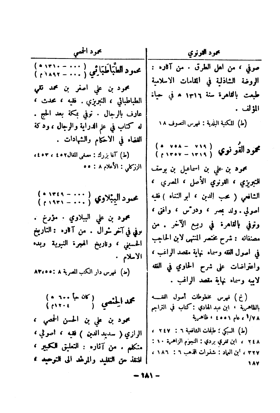 (ط) آغا بزرك: مصفى المقال 452، 453، الزركلي: الاعلام 8: 55 محمود الببلاوي (000 - 1349 هـ) (000 - 1931 م)