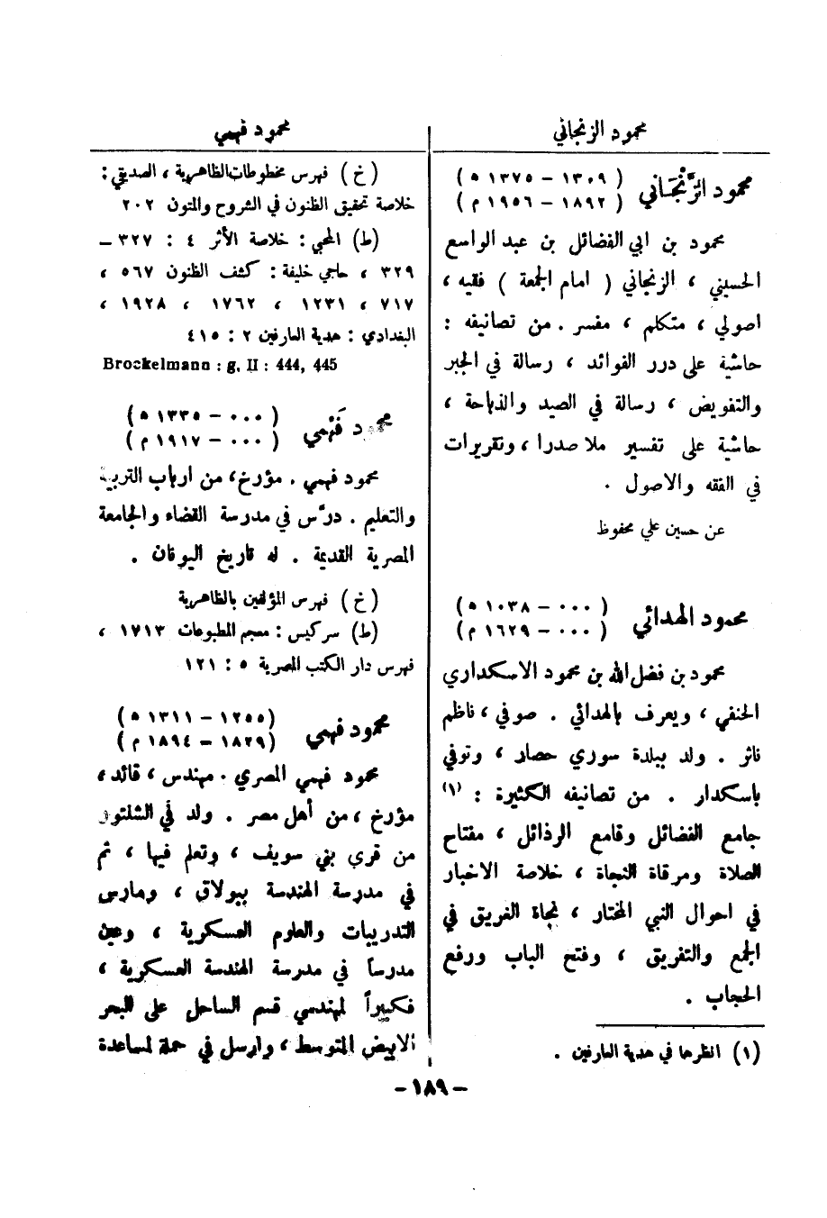 (ط) المحبي: خلاصة الاثر 4: 327 - 329، حاجي خليفة: كشف الظنون 567، 717، 1231، 1762، 1928، البغدادي: هدية العارفين 2: 415 445 , 444: Brockelmann: g , ll محمود فهمي (000 - 1335 هـ) (000 - 1917 م)