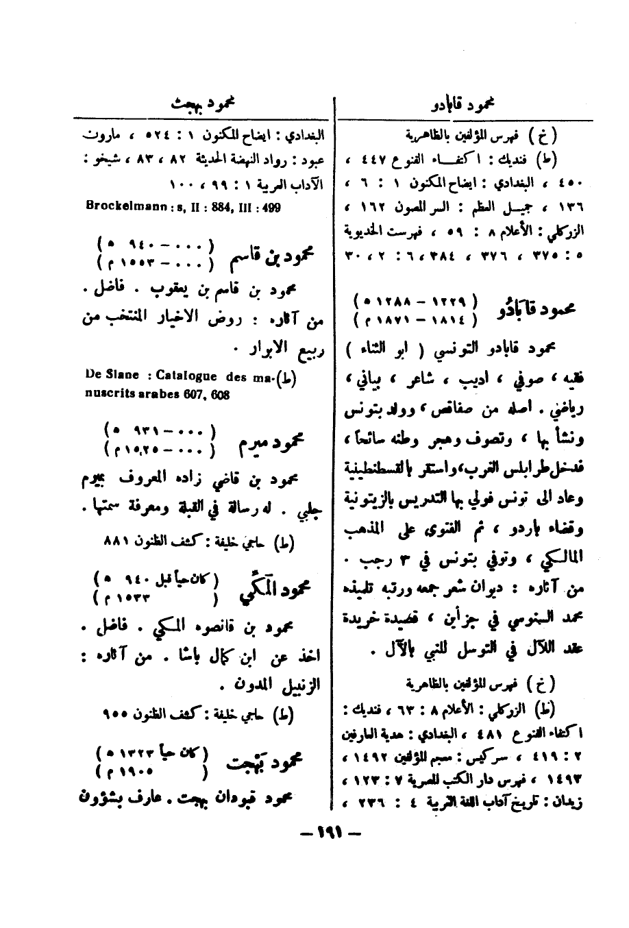 (ط) حاجي خليفة: كشف الظنون 955 محمود بهجت (كان حيا 1323 هـ) (1533 م)