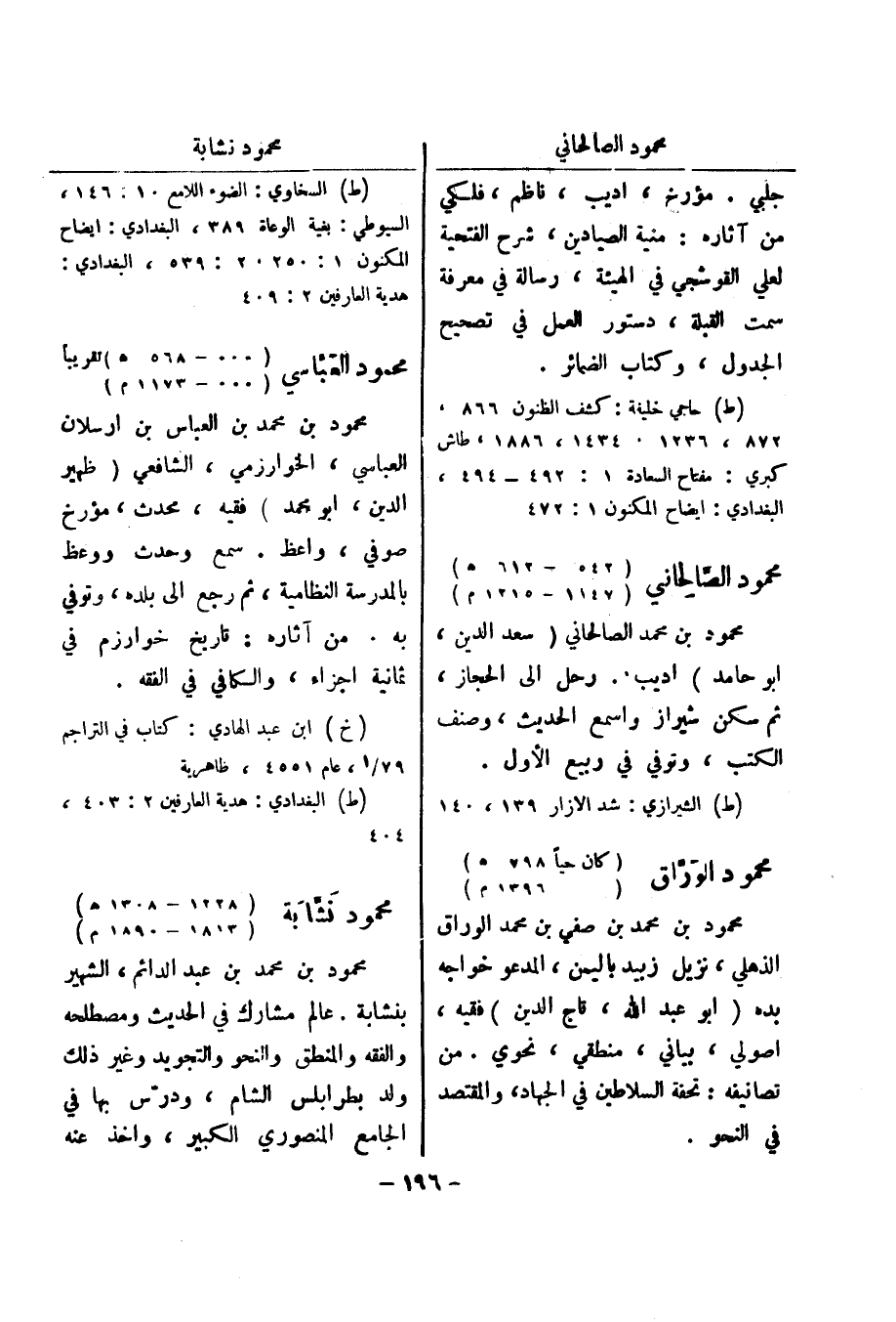 (ط) حاجي خليفة: كشف الظنون 866، 872، 1236، 1434، 1886، طاش كبري: مفتاح السعادة 1: 492 - 494، البغدادي: ايضاح المكنون 1: 472 محمود الصالحاني (542 - 612 هـ) (1147 - 1215 م)