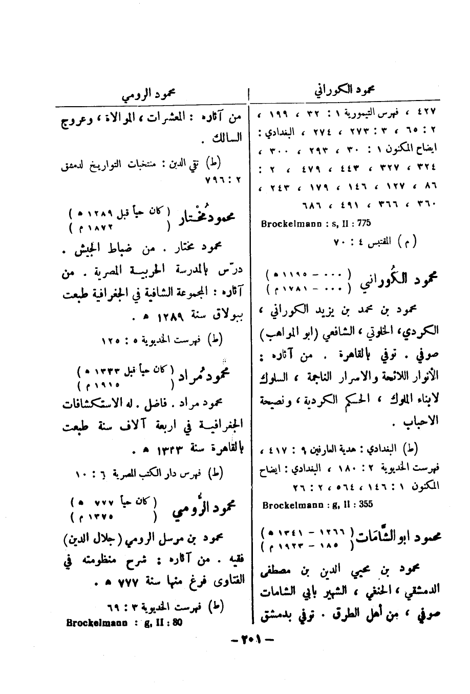 (ط) البغدادي: هدية العارفين 9: 417، فهرست الخديوية 2: 180، البغدادي: ايضاح المكنون 1: 146، 564، 2: 26 355: Broclelmann: g , ll محمود أبو الشامات (1266 - 1341 هـ) (185 - 1923 م)