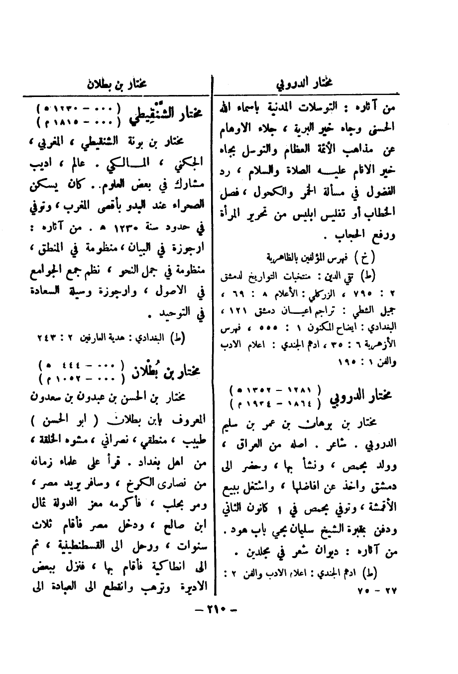 (ط) تقي الدين: منتخبات التواريخ لدمشق 2: 795، الزركلي: الاعلام 8: 69، جميل الشطي: تراجم اعيان دمشق 121، البغدادي: ايضاح المكنون 1: 555، فهرس الازهرية 6: 35، ادهم الجندي: اعلام الادب والفن 1: 195 مختار الدروبي (1281 - 1352 هـ) (1864 - 1934 م)