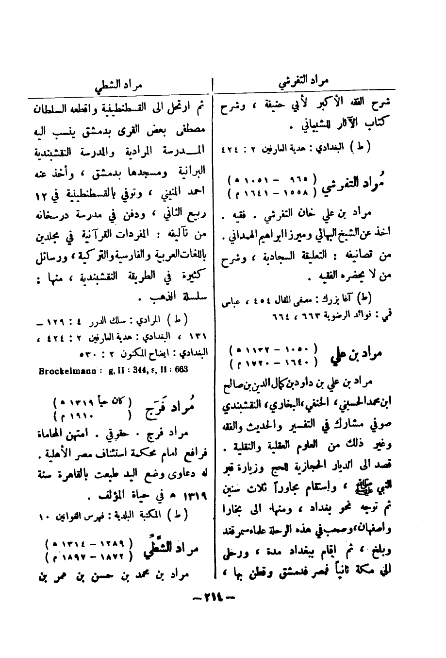 (ط) المرادي: سلك الدرر 4: 129 - 131، البغدادي: هدية العارفين 2: 424، البغدادي: ايضاح المكنون 2: 530 663: Brockelmann: g , ll: 443 , s , ll مراد فرج (كان حيا 1319 هـ)