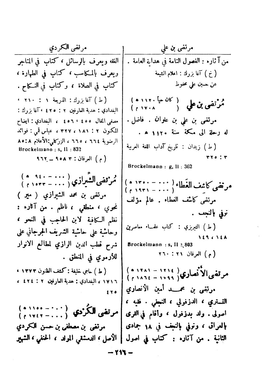 (ط) زيدان: تاريخ آداب اللغة العربية 3: 325 362: Brockelmann: g , ll مرتضى كاشف الغطاء (000 - 1350 هـ) (000 - 1931 م)