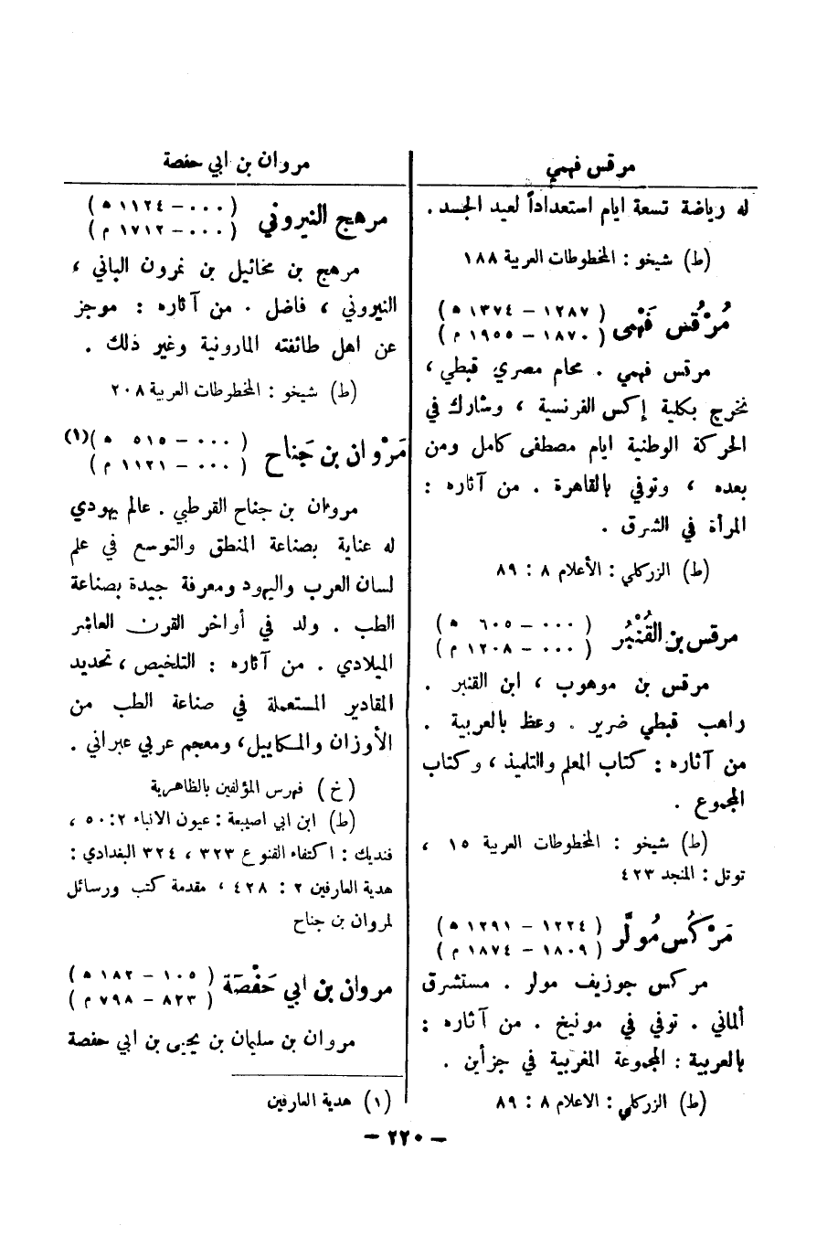 (ط) ابن ابي اصيبعة: عيون الانباء 2: 50، فنديك: اكتفاء القنوع 323، 324 البغدادي: هدية العارفين 2: 428، مقدمة كتب ورسائل لمروان بن جناح مروان بن ابي حفصة (105 - 182 هـ)
