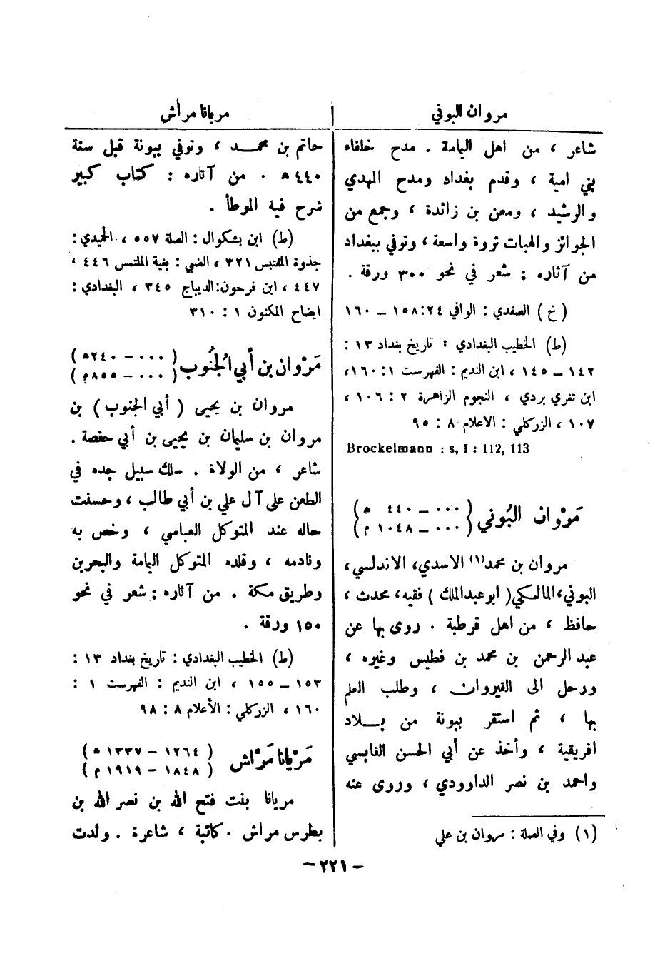 (ط) الخطيب البغدادي: تاريخ بغداد 13: 142 - 145، ابن النديم: الفهرست 1: 160، ابن تغري بردي، النجوم الزاهرة 2: 106، 107، الزركلي: الاعلام 8: 95 113 , 112: Brockelmann: s , l مروان البوني (000 - 440 هـ) (000 - 1048 م)