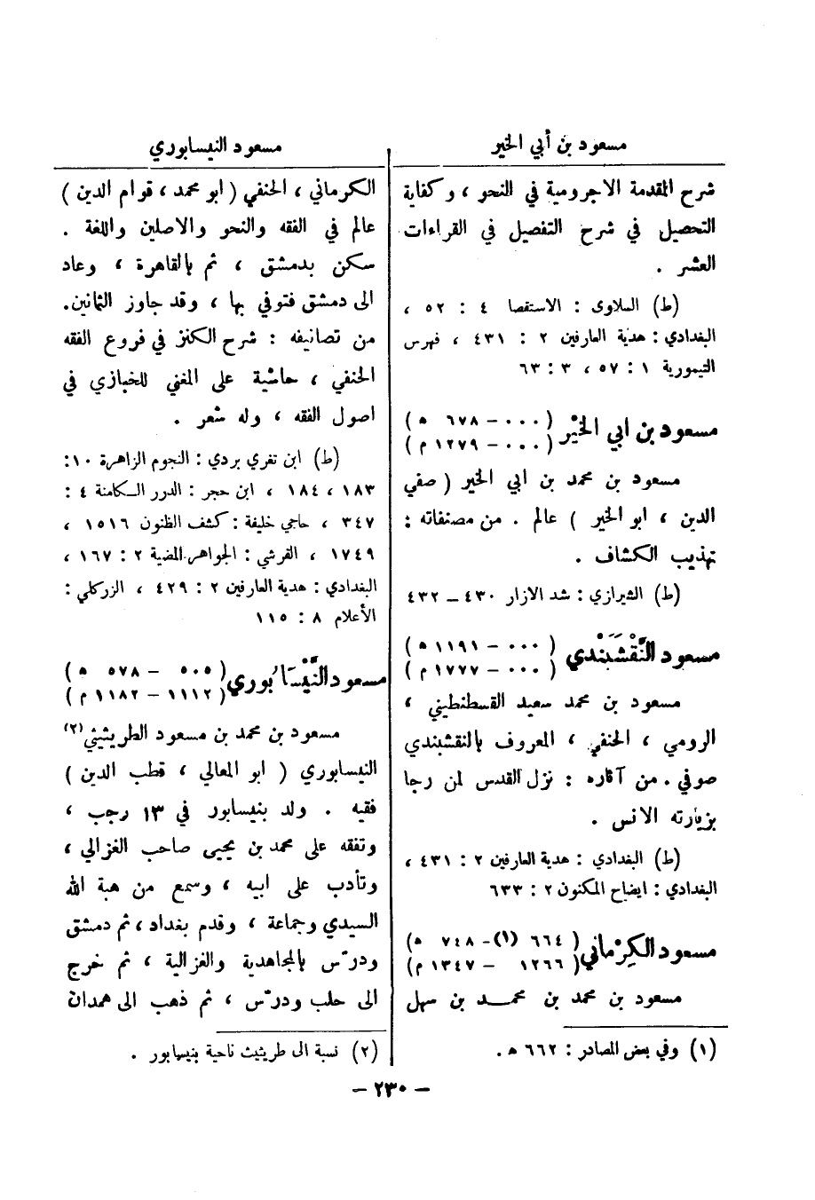 (ط) ابن تغري بردي: النجوم الزاهرة 10: 183، 184، ابن حجر: الدرر الكامنة 4: 347، حاجي خليفة: كشف الظنون 1516، 1749، القرشي: الجواهر المضية 2: 167، البغدادي: هدية العارفين 2: 429، الزركلي: الاعلام 8: 115 مسعود النيسابوري (505 - 578 هـ) (1112 - 1182 م)