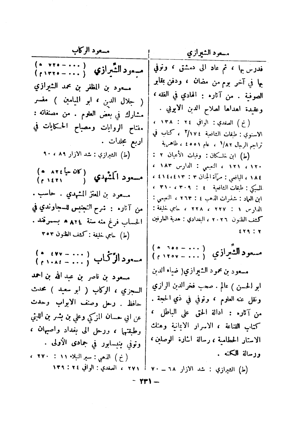(ط) ابن خلكان: وفيات الاعيان 2: 120، 121، النعيمي: الدارس 183، 184، اليافعي: مرآة الجنان 3: 413، 414، السبكي: طبقات الشافعية 4: 309، 310، ابن العماد: شذرات الذهب 4: 263، النعيمي: الدارس 1: 227، 228، حاجي خليفة: كشف الظنون 2026، البغدادي: هدية العارفين 2: 429 مسعود الشيرازي (000 - 655 هـ)