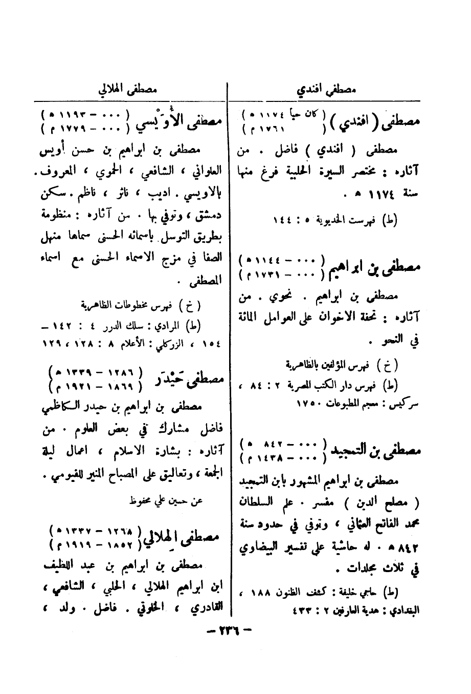 (ط) حاجي خليفة: كشف الظنون 188، البغدادي: هدية العارفين 2: 433 مصطفى الاويسي (000 - 1193 هـ)